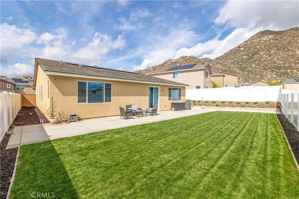 Welcome to this beautifully upgraded, move-in ready single-story home located in the highly desirable Hidden Terrace neighborhood of Menifee. Offering 4 Bedrooms, 2 Bathrooms, and approximately 2,336 Sq. Ft. of thoughtfully designed living space, this home combines modern style with everyday functionality. The open-concept layout is filled with natural light and creates a seamless flow between the kitchen, dining, and living areas, making it ideal for both daily living and entertaining. The kitchen features a large center island, granite countertops, a walk-in pantry, and ENERGY STAR GE appliances. The spacious primary suite serves as a private retreat with a spa-like bathroom that includes a soaking tub, glass-enclosed shower, dual vanities, and a generous walk-in closet. Additional features throughout the home include luxury vinyl plank flooring, fresh interior paint, upgraded ceiling fans, window coverings, a whole-home security system, and a water softener system. Situated on a premium lot, the fully finished backyard offers grass, concrete, upgraded drainage, sprinklers, and electrical already installed, providing a functional and low-maintenance outdoor space. Additional highlights include a Tesla backup battery. Located within the sought-after Hidden Terrace community in Mountains Edge, residents enjoy nearby parks, walking trails, and convenient access to shopping, dining, and major commuter routes including the 215 and 74. This home offers a rare combination of upgrades, location, and move-in readiness. Schedule your private showing today.