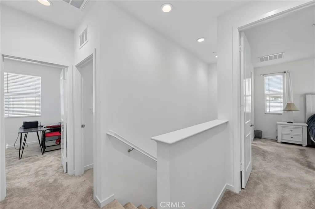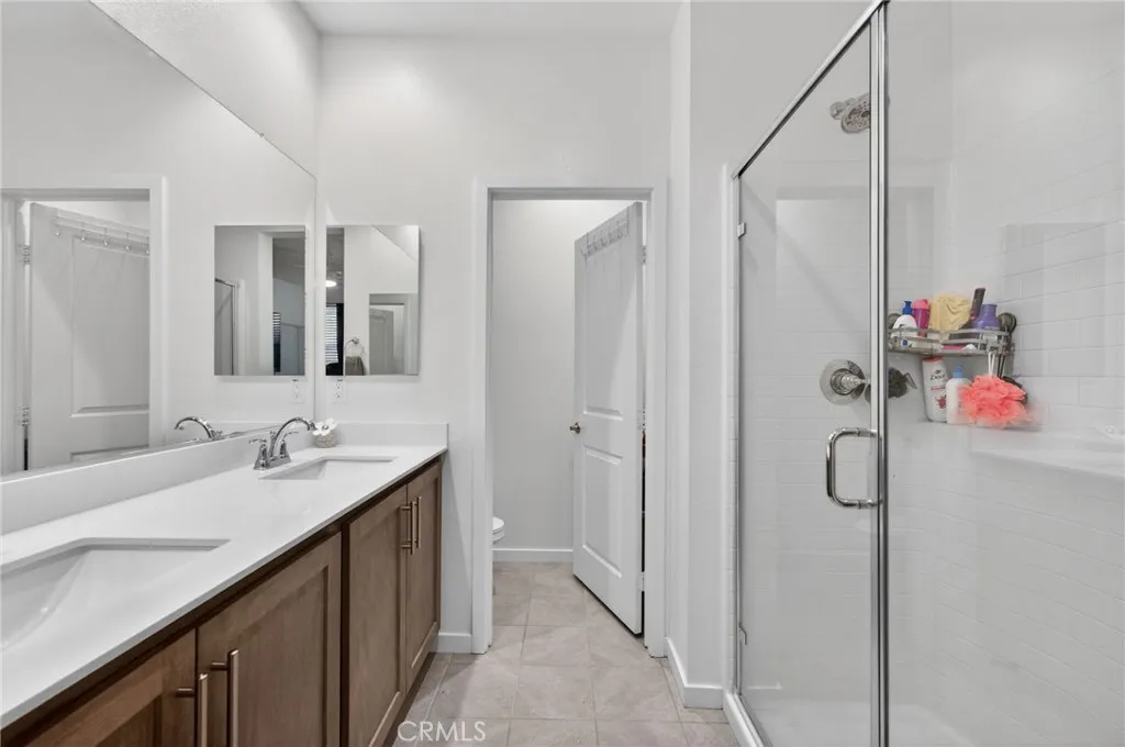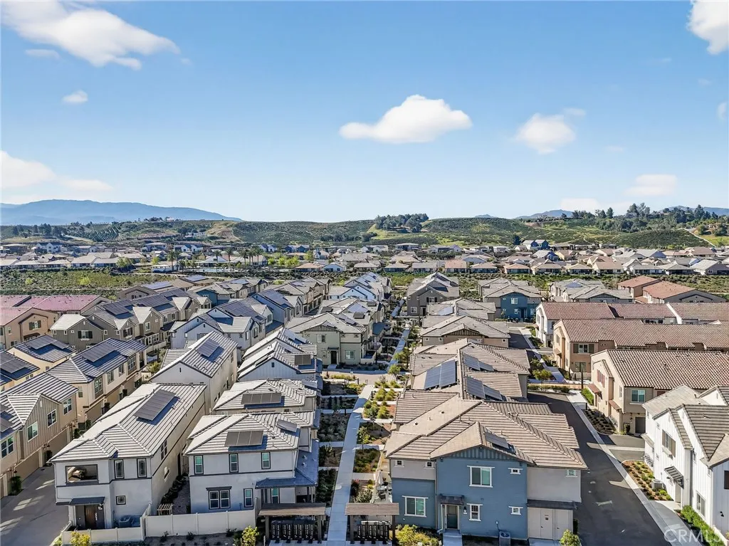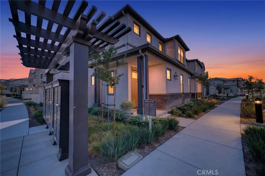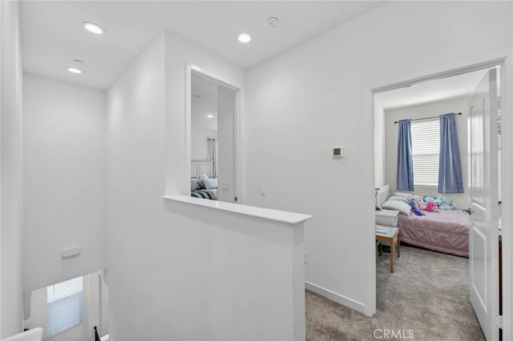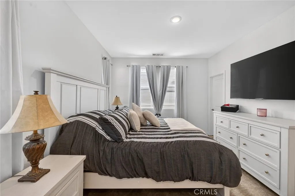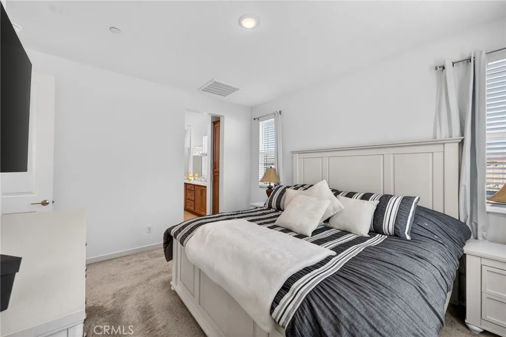 Built in 2023, this 4-bedroom, 3.5-bathroom home offers 1,829 square feet of well-appointed living space in the highly sought-after Sommers Bend community in Temecula. The floor plan includes a private downstairs bedroom with a full en-suite bathroom, a rare feature perfect for extended family, along with a dedicated half bath on the main level for guests. The open-concept kitchen is anchored by a granite center island with an undermount stainless steel sink, warm wood cabinetry, recessed lighting, and stainless steel appliances including a refrigerator and dishwasher. Luxury vinyl plank flooring runs throughout the kitchen and main living area. The dining space opens through a sliding glass door to a private side courtyard with paver hardscape a low-maintenance outdoor retreat perfect for everyday use or casual entertaining. Upstairs, the primary suite features dual windows with drapes, a dual-sink quartz vanity, framed mirrors, and a glass-enclosed walk-in tile shower. Two additional bedrooms share a full bathroom on the upper level. Carpet runs throughout all bedrooms and the entire upper floor. A carpeted staircase with white wood railing connects both levels. A 2-car attached garage and leased solar panels complete the home. Sommers Bend residents enjoy resort-style amenities including a pool and spa, a designer clubhouse, covered outdoor lounge areas with ceiling fans, basketball courts, tot lots, and miles of walking and biking trails with panoramic mountain and rolling hill views. Situated within the Temecula Valley Unified School District and minutes from Temecula