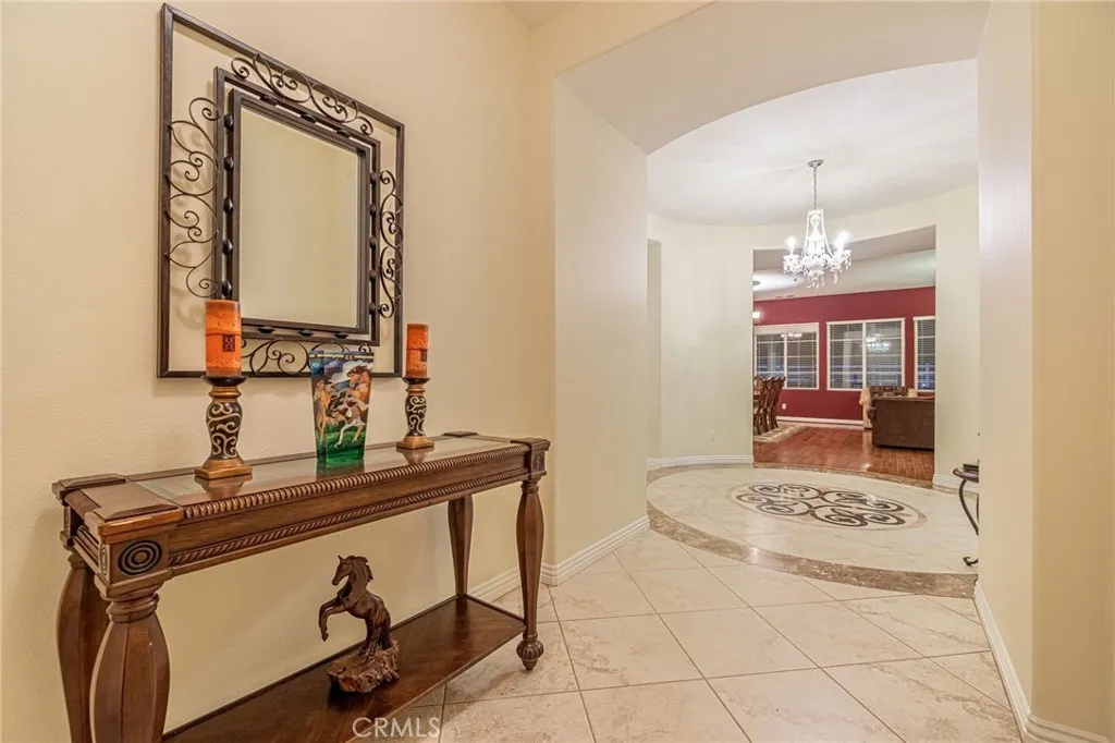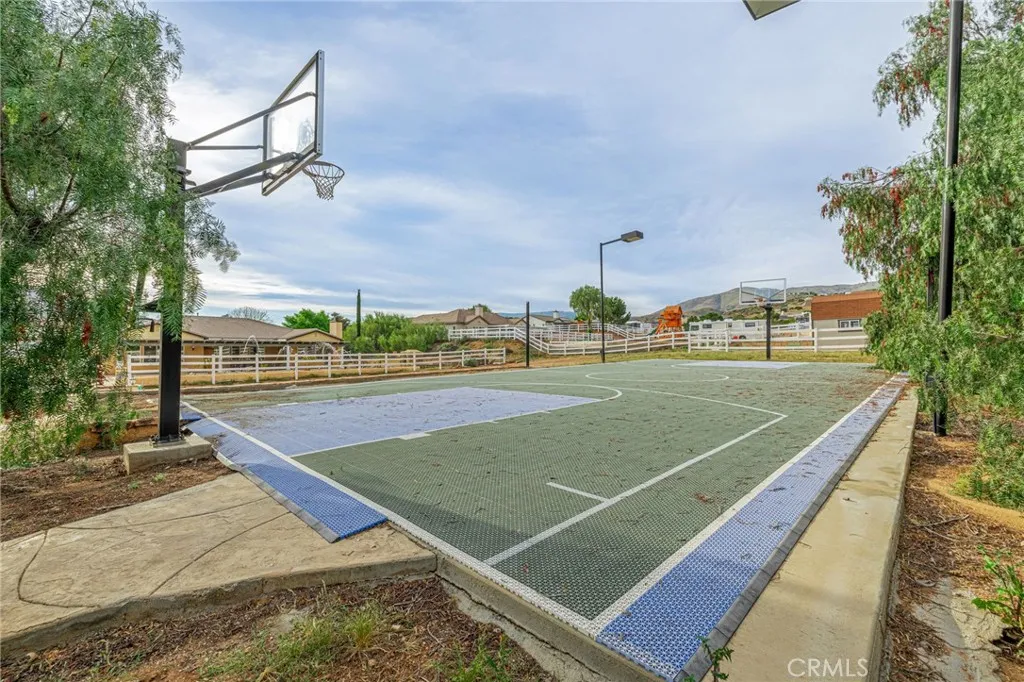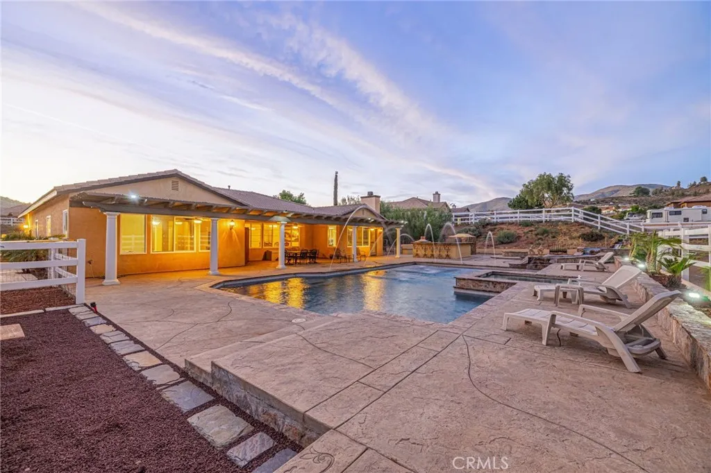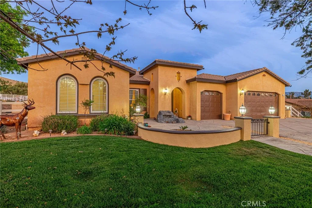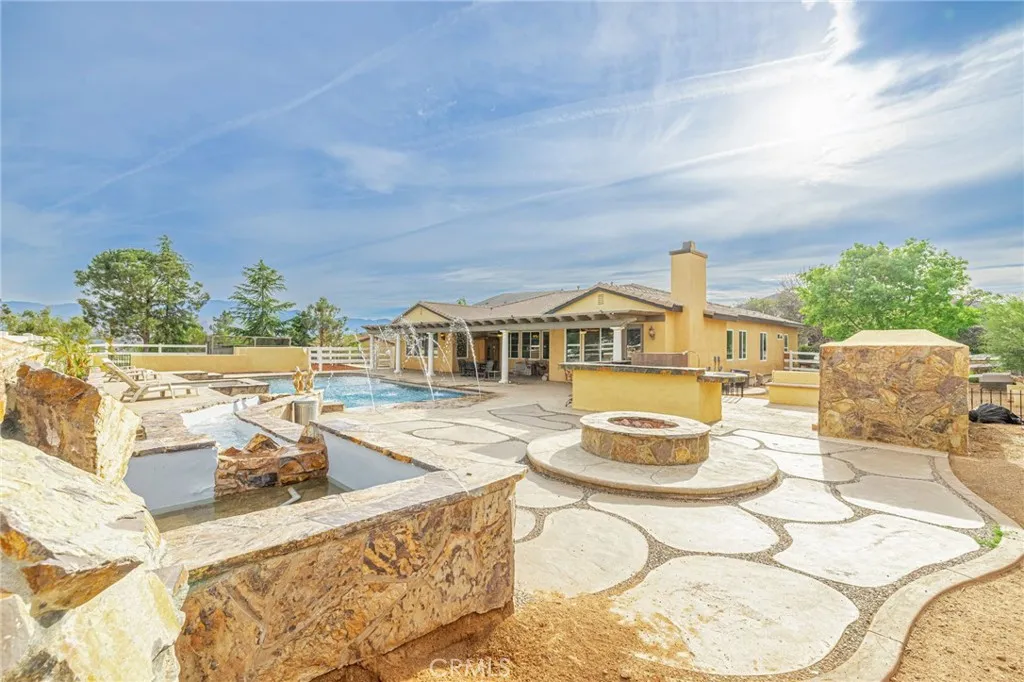 Welcome to your private Acton retreat, where comfort, elegance, and outdoor living come together on a beautifully maintained property with breathtaking mountain views. This spacious single-story home offers exceptional curb appeal with its warm stucco exterior, tile roof, and inviting gated courtyard entry complete with a tranquil water feature. Step inside to a grand formal entry featuring soaring ceilings, a custom tile medallion, and an elegant chandelier that sets the tone for the home. The thoughtfully designed floor plan includes a formal dining room, perfect for entertaining, and an expansive living area with a cozy fireplace and abundant natural light. The chefs kitchen is the heart of the home, showcasing rich wood cabinetry, granite countertops, stainless steel appliances, a large center island with bar seating, and a sunny breakfast nook that opens to the family roomideal for everyday living and gatherings. The spacious primary suite offers a relaxing retreat with a generously sized walk-in closet, spa-like bathroom featuring dual vanities, a soaking tub, a separate shower. Additional bedrooms are well-sized and versatile for guests, office space, or hobbies. Step outside to your own private resort. The incredible backyard is designed for entertaining and relaxation, featuring a sparkling pool and spa with water features, expansive stamped concrete decking, two built-in fire pits, and a fully equipped outdoor kitchen with a pizza oven and bar seating. A covered patio provides the perfect space for outdoor dining while enjoying the peaceful surroundings and scenic