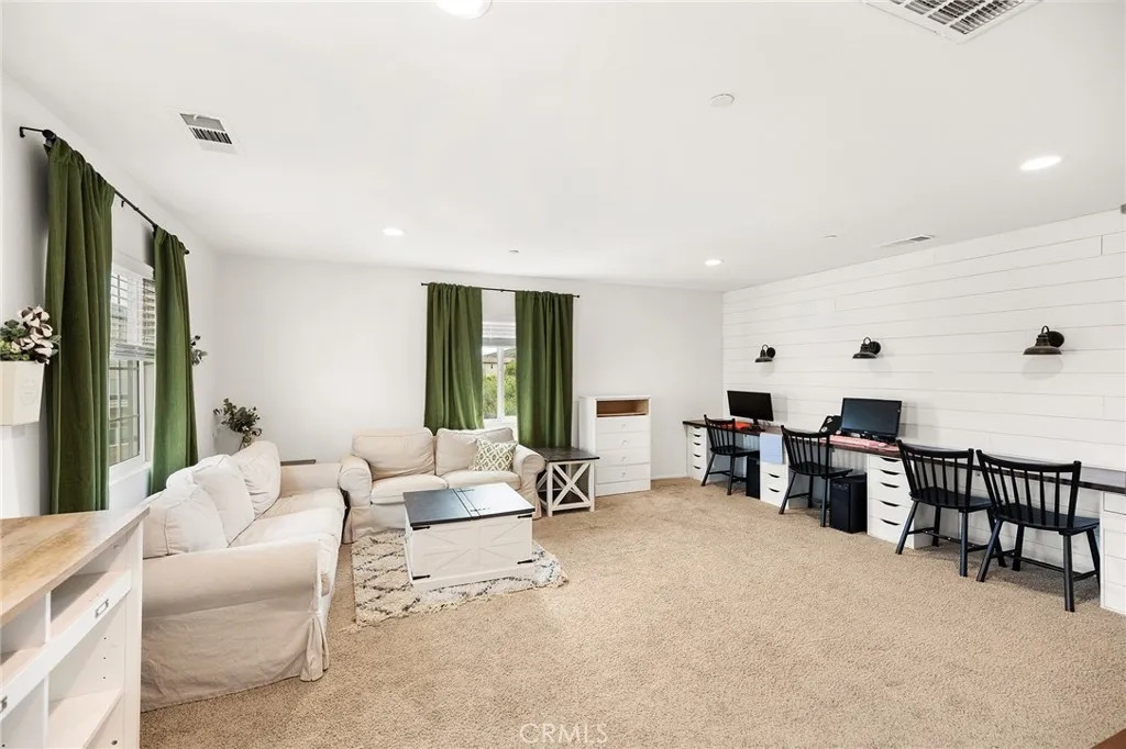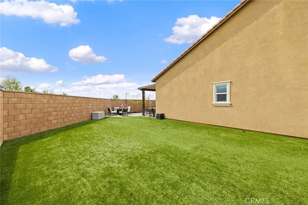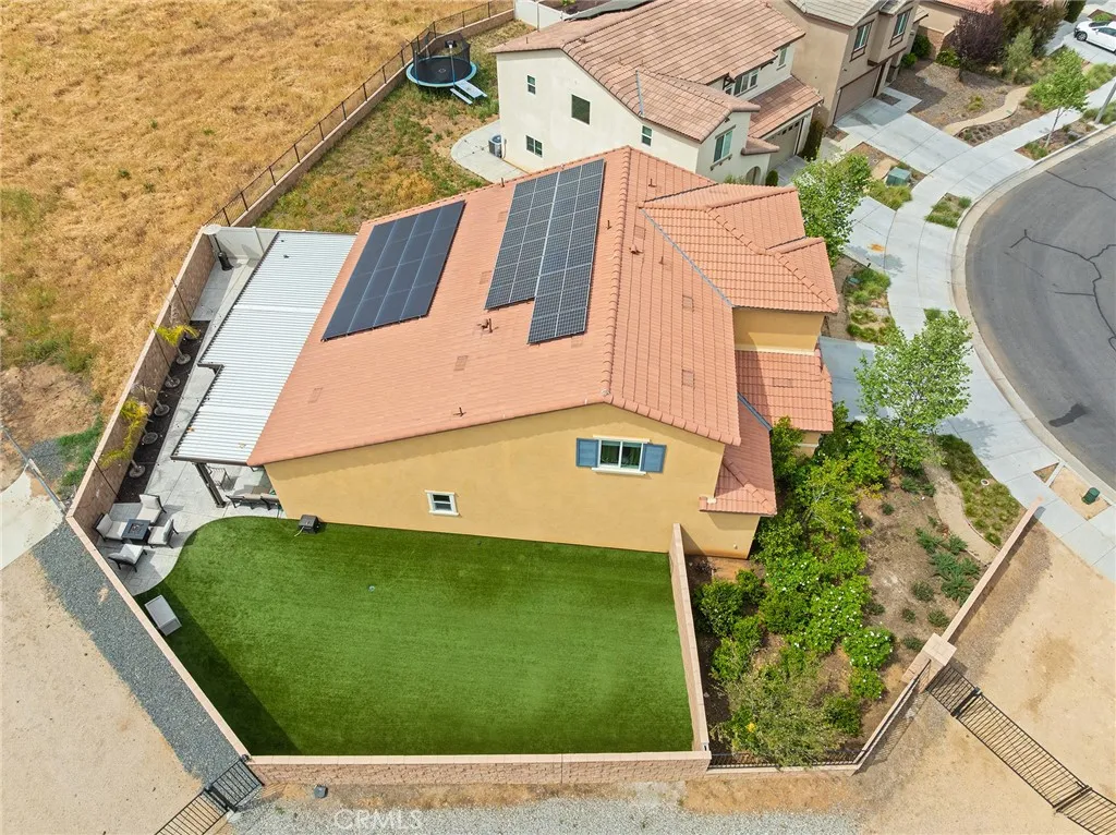 Super unique lot with only one adjoining neighbor, offering added privacy. This spacious 5-bedroom home features a highly desirable layout with both the primary suite and a secondary bedroom conveniently located on the first floor. As you enter, youre welcomed by a wide, inviting hallway that sets the tone for the homes open feel. The main living area feels bright and spacious with soaring vaulted ceilings. The cozy family room opens to the beautifully appointed kitchen, featuring quartz countertops, gorgeous white cabinetry, upgraded appliances, a charming coffee bar area, large center island, and an oversized dining area. Downstairs includes a spacious secondary bedroom, full bathroom, and a generous primary suite with dual sinks, step-in shower, vanity area, and a large walk-in closet. A convenient downstairs laundry room adds to the homes functional layout. Upstairs, youll find a huge loft with a custom built-in desk area that can easily be removed if desired, along with three additional well-sized bedrooms and a full bathroom with tub/shower combo and dual sinks. The backyard is a true entertainers delight with a large Alumawood patio cover the runs the entire length of the back of the home, custom concrete patio, expansive turf area, concrete fencing for added privacy and low maintenance, plus vinyl fencing on one side. Energy efficiency is a standout feature with two solar systemsone fully paid off and the other with an affordable leasehelping to significantly reduce utility costs. Garage has been wired with 220 outlet for your potential car charging station. Located