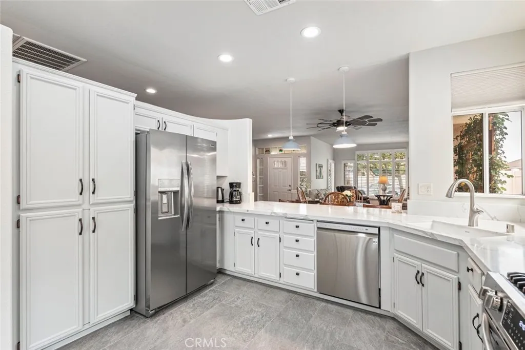 Welcome to resort-style living at its finest in The Club, a vibrant 55+ community designed for active adults seeking comfort, connection, and ease. This beautifully updated single-story home offers 3 bedrooms, 2 bathrooms, and 1,427 square feet of thoughtfully designed living space. From the moment you step inside, youll appreciate the fresh interior paint and new flooring that create a light, modern feel throughout. The remodeled kitchen serves as the heart of the home, featuring elegant stone countertops, updated cabinetry, new appliances and ample storageperfect for both everyday living and entertaining. The open layout flows seamlessly into a bright and inviting living room complete with a cozy fireplace, custom plantation shutters, and an updated built-in entertainment center. Flexible living options include a secondary bedroom ideal for a home office or den. The spacious primary suite offers vaulted ceilings a custom wall covering and a beautifully updated en-suite bathroom with dual vanities and a walk-in shower. Both bathrooms have been tastefully refreshed, enhancing the homes overall appeal. Step outside to enjoy low-maintenance front and backyard spaces designed for easy living. Additional highlights include direct access to a two-car garage, central heating and air, and durable vinyl fencing. Life at The Club is all about enjoying the little moments and the everyday luxuries. Residents are treated to a wonderful collection of amenitiesfrom a sparkling heated pool and relaxing spa to inviting BBQ areas perfect for gathering with friends. Theres something for ever