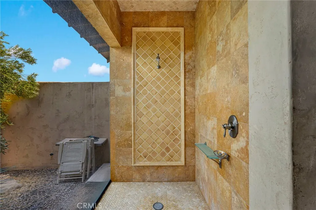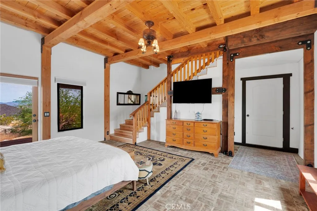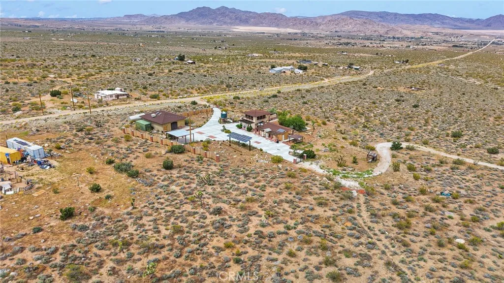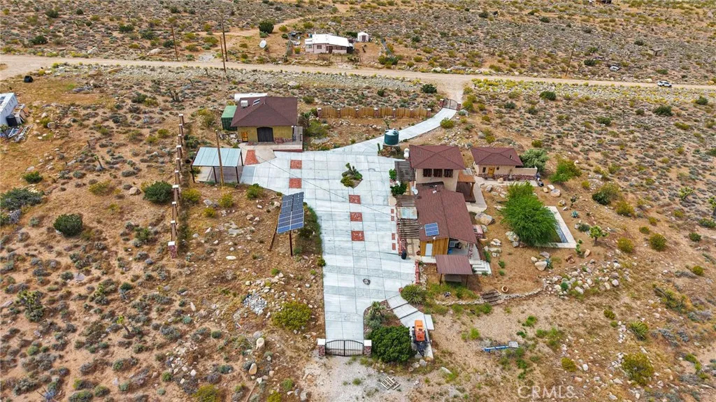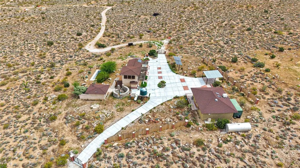 Spanish-style Hacienda! Paid Solar on five expansive acres in the Mojave Desert presents a distinguished residence of exceptional character and superior construction quality. The property commands unobstructed 360 degree valley panoramas visible from virtually every window throughout the home. The interior encompasses 1764 square feet of thoughtfully designed living space, featuring soaring beamed ceilings and an open-concept layout bathed in natural light. Custom patterned travertine tile establishes an immediate sense of refined craftsmanship. The chef's kitchen is appointed with marble countertops, custom cabinetry, an upgraded slide-in stove, artisan tile backsplash, and a farmhouse sink with coordinating faucet. The primary bedroom showcases patterned brick flooring and a glass door providing direct access to the remarkable backyard. A second-story loft offers versatile functionality as a game room, additional bedroom, or office with outstanding views. The custom walk-in atrium shower, featuring floor-to-ceiling glass overlooking a planted atrium of trees and shrubs, represents a truly distinctive architectural element. Outdoor amenities include a covered patio, front porch, barbecue island overlooking the pool and valley, a generous circular fire pit with dedicated entertaining area, and a gazebo collectively forming an exceptional outdoor living environment. The property's infrastructure is equally noteworthy. Paid solar with battery backup operates independently or grid-connected, supplemented by three mini-split systems, an evaporative cooler, and a wood-burning s