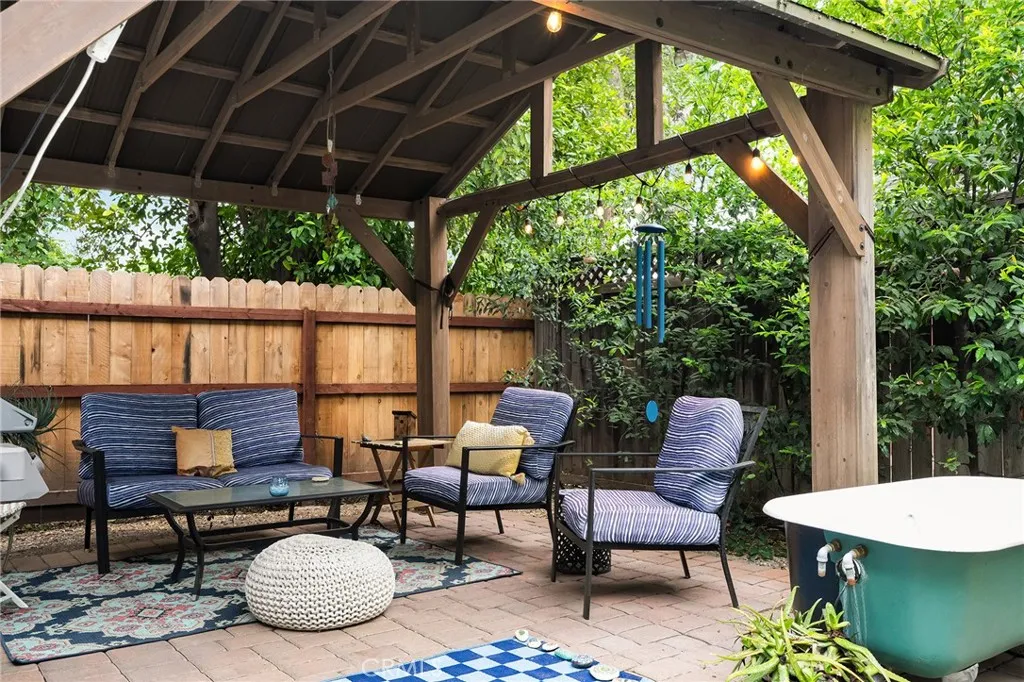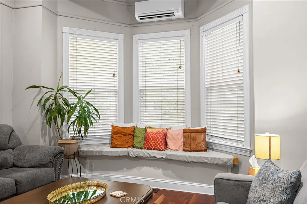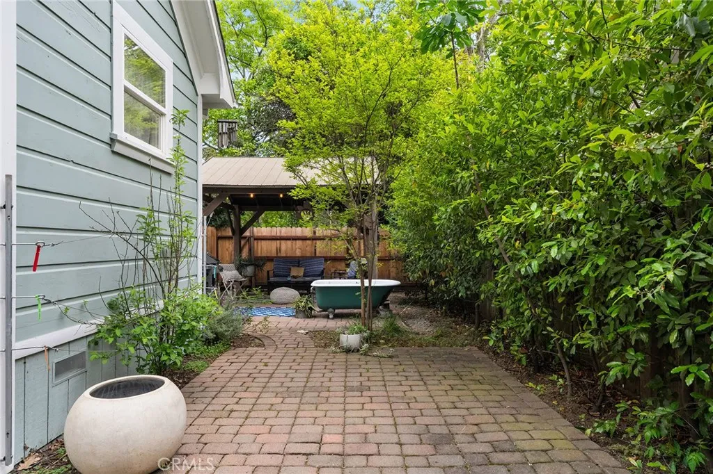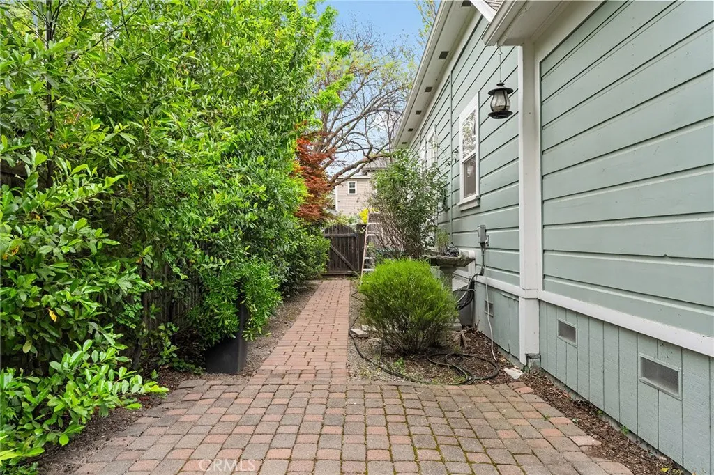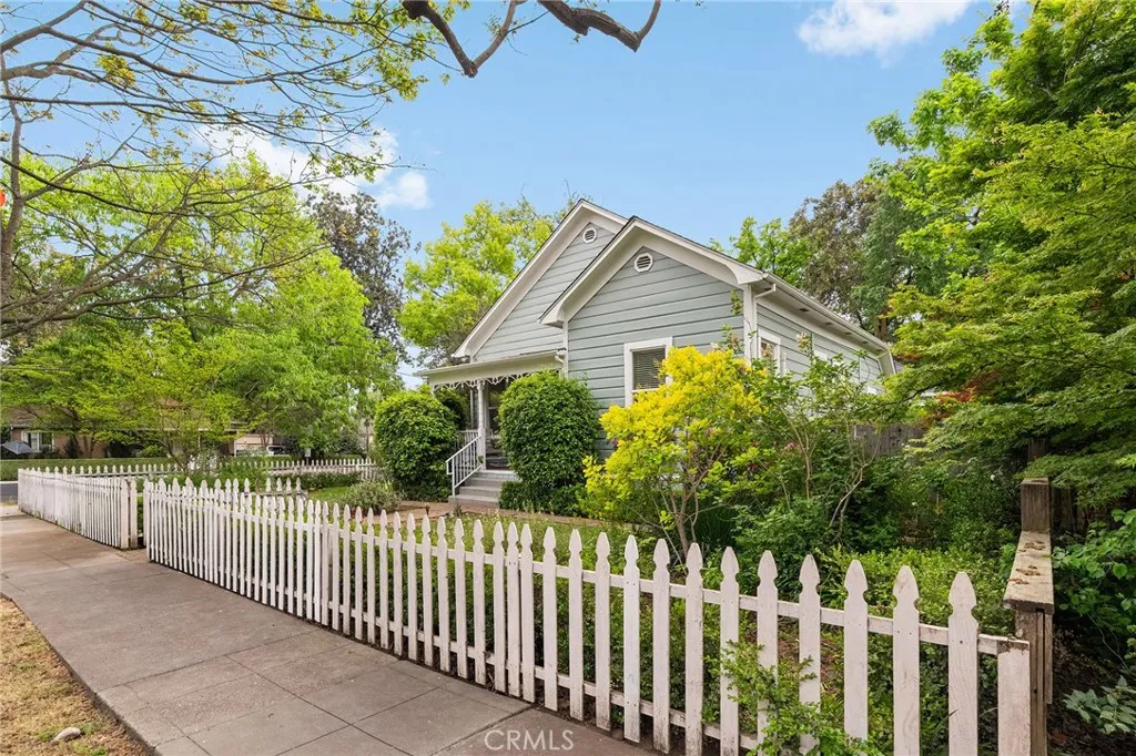 Welcome to this storybook home that blends classic Chico character with updated amenities and solar. A white picket fence, cobblestone pathways, mature landscaping and an inviting front porch set the tone before you step inside the mahogany door. Soaring ceilings and rich floors enhance the bright, spacious living room, anchored by a large bay window perfect for sunlight and reading nooks. The dining area and kitchen are ideal for entertaining, featuring white cabinetry, white appliances and a built-in buffet. Three roomy bedrooms offer updated flooring and high ceilings for an airy feel. The bathroom is timeless with black-and-white tile and a new shower. Thoughtful details include crown molding, wood-paneled doors, dual-pane windows with blinds, and convenient indoor laundry. Outside, the fully gated backyard provides privacy and a generous patio for relaxing, BBQs or weekend brunches. Excellent locationjust moments from Bidwell Park and Downtown Chico. A beautifully maintained home with timeless curb appeal and modern livability.