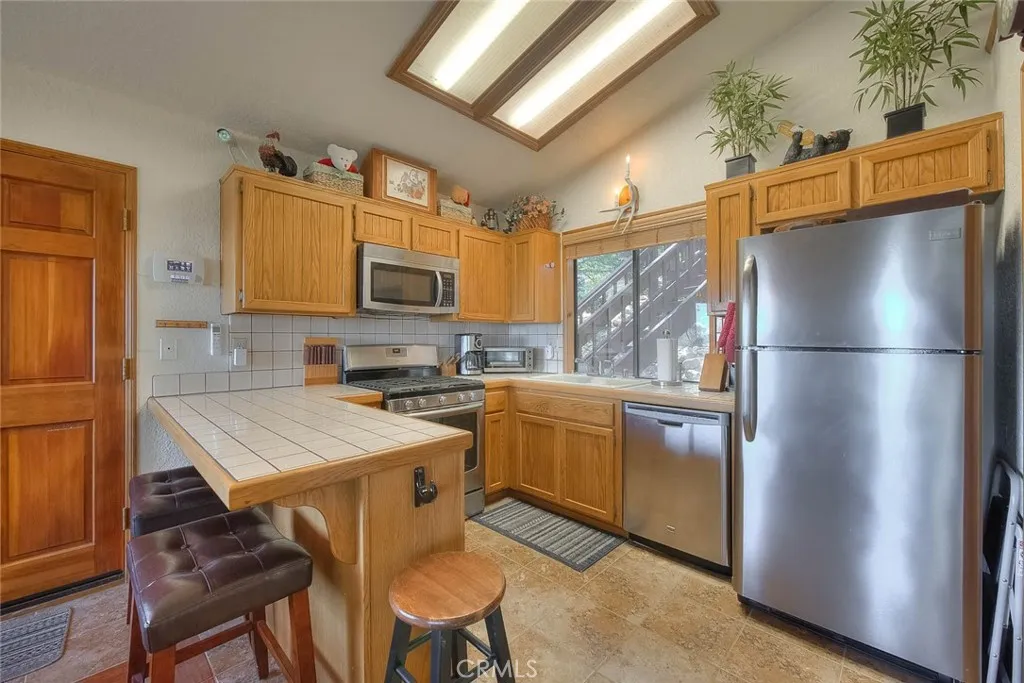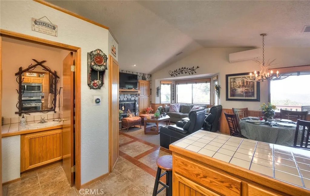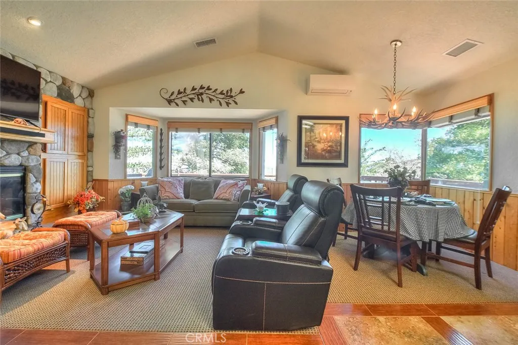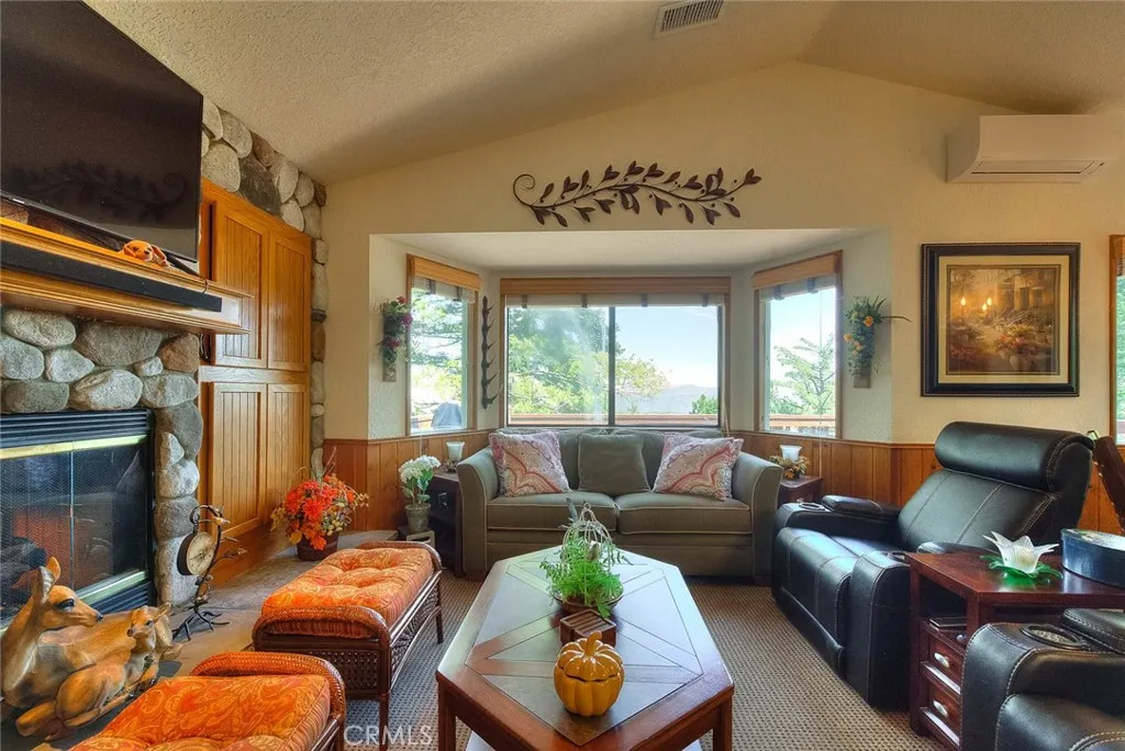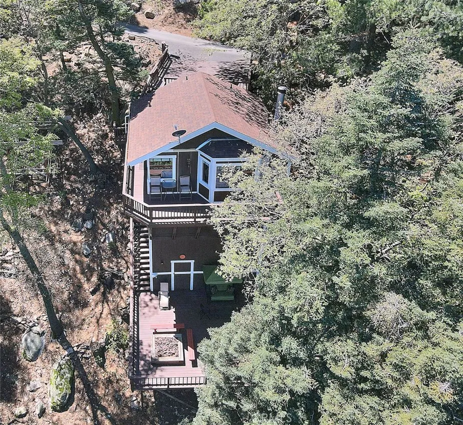 Model perfect home is being sold fully furnished, just pack some clothes and start living your mountain dreams! Fabulous remote feeling 2 story getaway just 20 minutes from San Bernardino and 5 minutes from Lake Gregory. Stunning tree house views from 2 expansive decks give you tons of usable outdoor space with minimal upkeep. New roof, newer paint, reinforced 2 car parking deck, cozy stone fireplace, central heat and air and an additional split system upstairs to keep comfortable. Beautiful decor and upgraded appliances including washer, dryer and stainless steel 5 burner stove, dishwasher, fridge, microwave and garbage disposal. There is a winch system to the huge bottom deck, making it a breeze to entertain or just enjoy the fire pit, wrought iron swing and fabulous forest views.