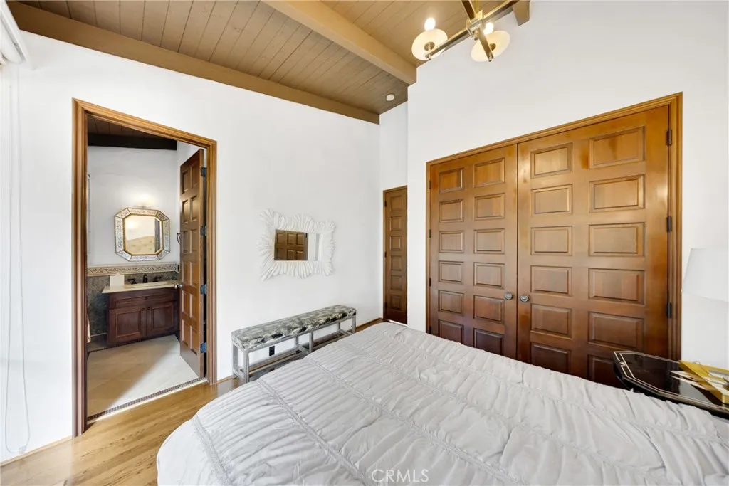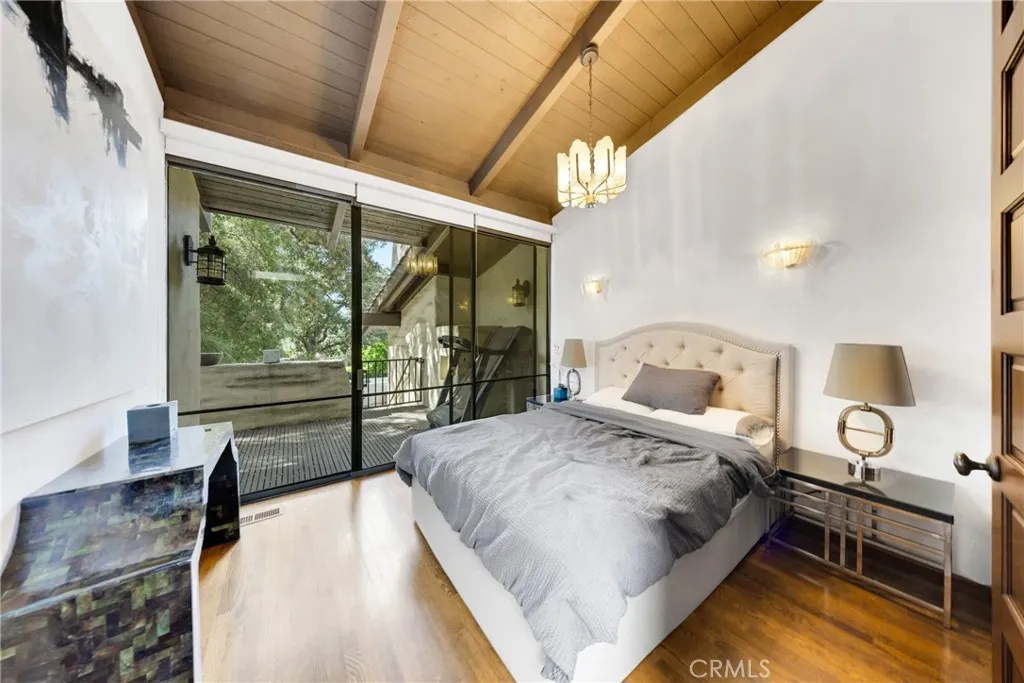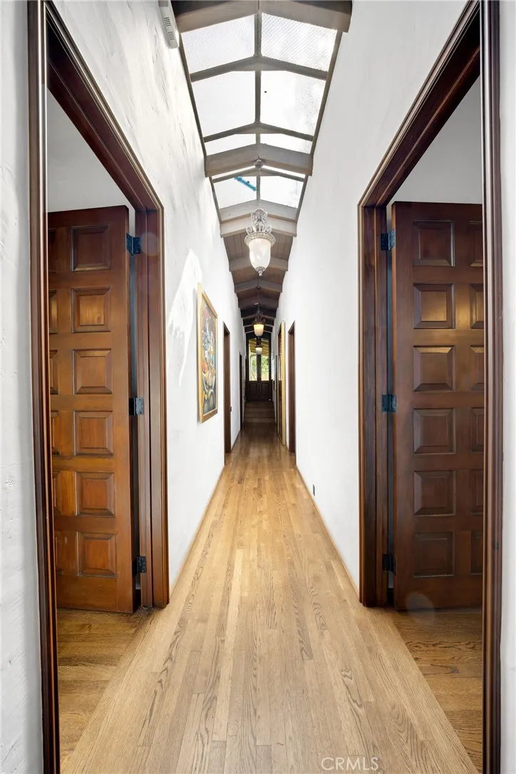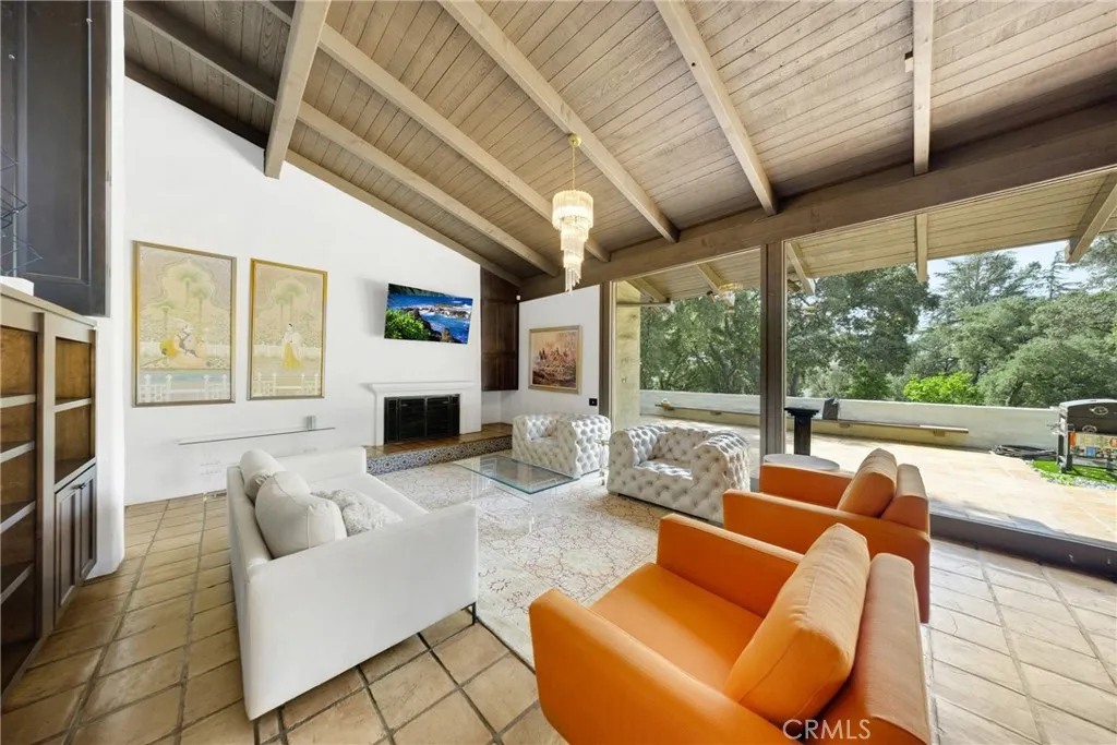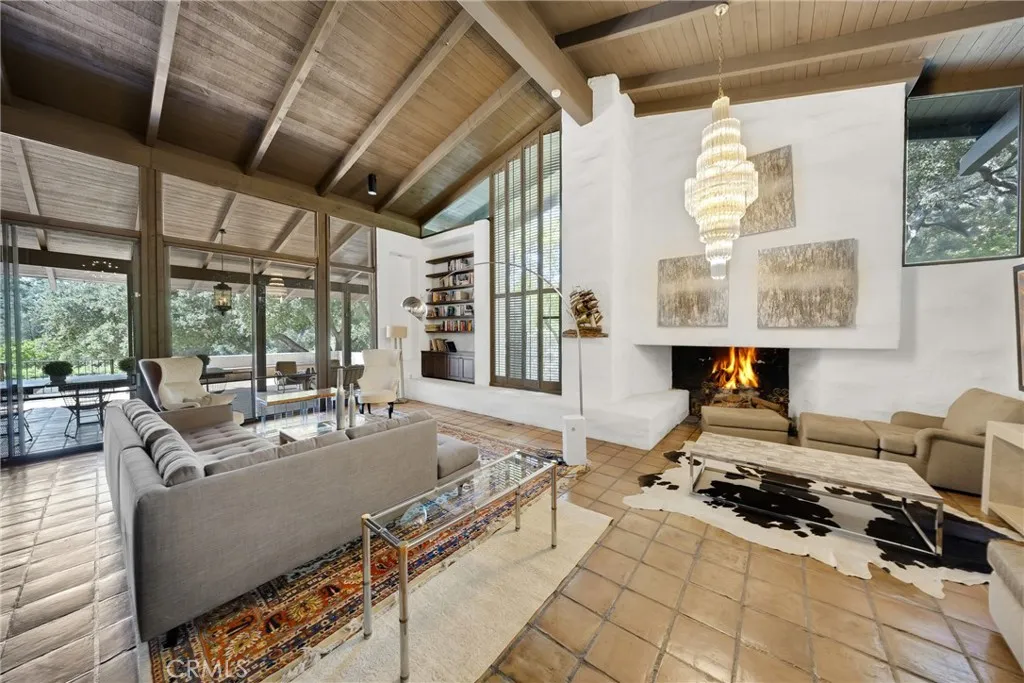 A contemporary Spanish estate featuring an original rustic post-and-beam design, seamlessly restored to a refined, modern standard. Designed/restored by James V. Coane & Associates, a Pasadena-based firm known for high-end residential estates, historic renovations, and a focus on intimate interior and exterior details. The home features dramatic, light-filled spaces with walls of glass that connect the indoor living areas to the surrounding landscape, promoting a seamless indoor-outdoor lifestyle. A spacious floor plan featuring 6-bedroom configuration, including a separated master suite for enhanced privacy. A dramatic foyer featuring paver floors, leading into the main living areas. A custom gourmet kitchen equipped with high-end, built-in appliances and custom lighting. Open-concept living and dining rooms designed for entertainment, including butler stations and two fireplaces. Situated on nearly one acre of landscaped grounds, featuring mature oak trees and a quiet, natural environment. A vast patio area designed for entertaining, complete with an outdoor BBQ/kitchen, water fountain, and a pool. Attached garage features a 3-car, extra-sized garage and additional storage space.