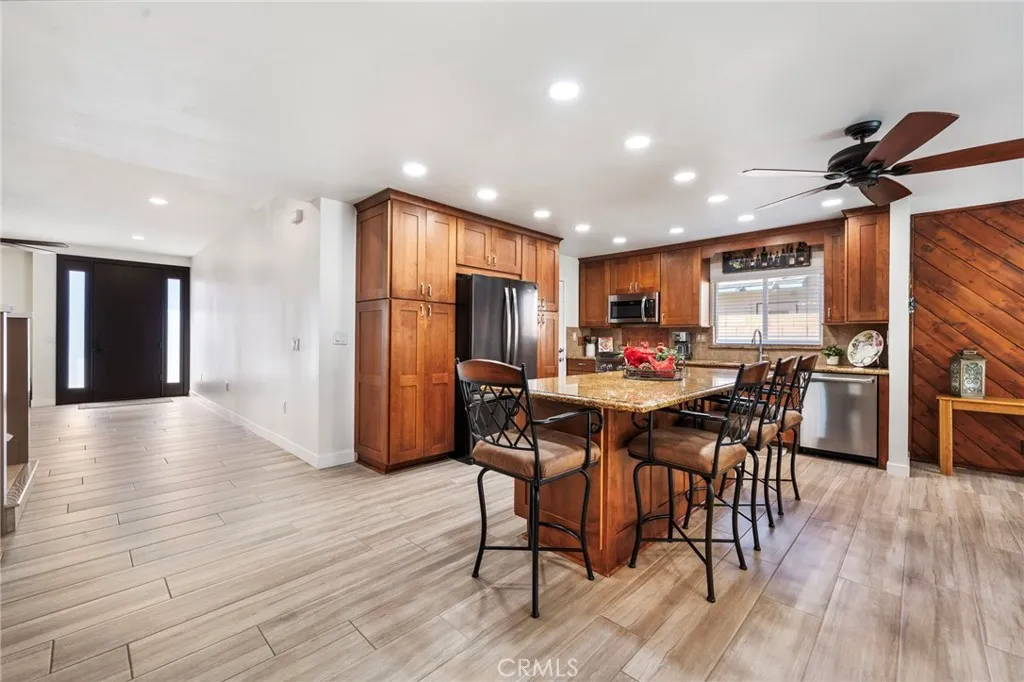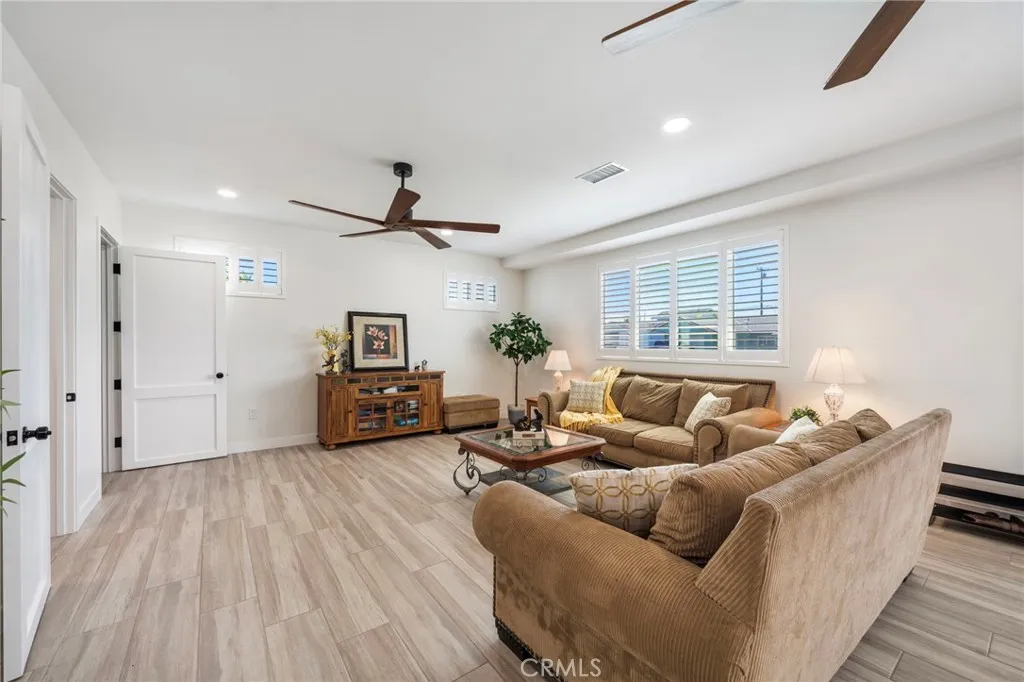 Absolutely stunning and extensively expanded, this gorgeous pool home offers 4 bedrooms, 3.5 baths, a spacious loft (easily a 5th bedroom), and approximately 2,510 square feet of beautifully upgraded living space in a pride-of-ownership neighborhood on the border of Huntington Beach and Fountain Valley. Completely reimagined just two years ago with a permitted two-story front addition, this home showcases a grand formal living room with 9 foot ceilings, porcelain wood-grain tile flooring, ceiling fans, recessed lighting, dual pane windows, plantation shutters, and custom 7.5 foot solid wood interior doors, with an elegant half bath and inside laundry room conveniently located off this space. A striking White Oak staircase with custom wrought iron railing leads to the all-new second level featuring a versatile loft ideal for a bedroom, office, or playroom, and a luxurious primary suite with dual closets, ceiling fan, and a spa-inspired ensuite boasting quartz vanity, designer tile flooring, linen storage, and a stunning walk-in shower with floor-to-ceiling tile, multiple shower heads, and frameless glass enclosure. The expansive open-concept layout flows seamlessly from the new living room into the original home, now beautifully integrated with a gourmet kitchen featuring granite countertops, a large center island with wrap-around seating, custom cabinetry with pull-outs, two pantries, and stainless appliances including gas range, microwave, and dishwasher, all open to a banquet-size dining area and inviting family room with brick fireplace and a dramatic angled wood-slat ac