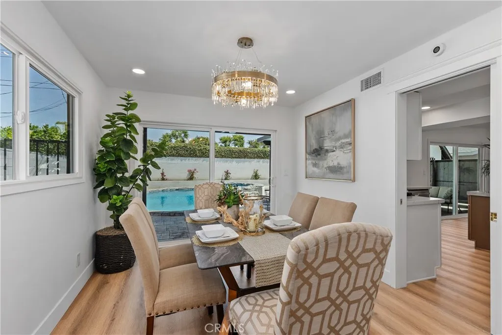 This stunning Fullerton home has been renovated with the finest materials and unwavering attention to every detail, so it feels luxurious yet inviting the moment you step inside. The showstopper new backyard beckons with a new pool with four fountains, spa, and a waterfall-firepit that elevates evenings to resort-level entertaining, while the updated bathrooms and gourmet kitchenwith abundant cabinetry, a striking marble island, and new appliances with warrantiesmake daily living a joy. Youll notice the bright, energy-efficient feel of new double-panel windows, copper plumbing, upgraded electrical, new flooring, and fresh paint, plus a tasteful accent wall that adds character and elegance. The open layout flows beautifully, with calming views from the living area to the backyard oasis and night-time magic with the four fountain and color-changing pool lighting that create a heartwarming, immersive atmosphere. Tucked on a quiet, tree-lined street in one of Fullertons most desirable neighborhoods, this 4-bedroom, 3-bath home offers over 2,109 sqft of timeless charm blended with modern luxury. The main level welcomes you with a cozy living room featuring a bay window and fireplace, a formal dining area, a main-floor bedroom with a full bath, and a convenient laundry room, while glass modern stair rails add a sleek contemporary touch. Upstairs, three more spacious bedrooms each with their office nooks and one or two walk-in closet. All bathrooms have been updated with high-end designer finishes. The outdoor space is an entertainers dream, a sunken firepit with a waterfall, a ra
