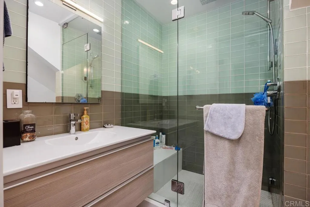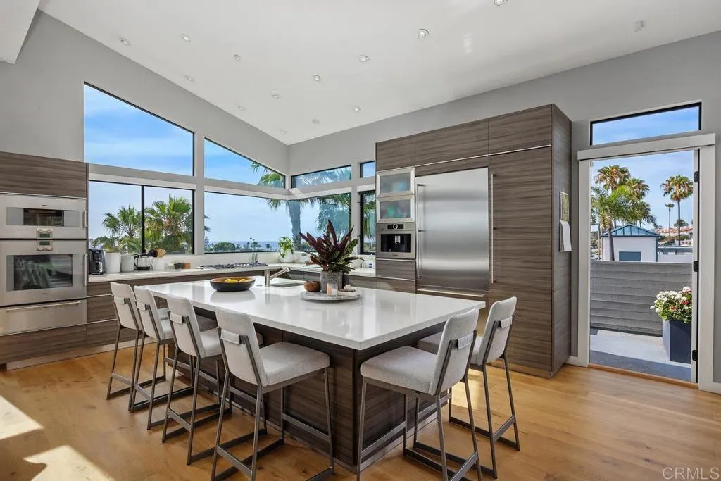 Rare opportunity to own a stunning contemporary coastal residence west of I-5 in one of Encinitas most coveted locations, just steps from the beach and vibrant downtown Encinitas. Situated on highly desirable E Street, this home offers the ultimate Southern California lifestyle with close proximity to world-class surf, sandy beaches, boutique shopping, and top-rated dining. Designed with a sleek, modern aesthetic, the home showcases clean lines, vaulted ceilings, and an open-concept floor plan filled with natural light. The gourmet kitchen is a true centerpiece, featuring upgraded wood cabinetry, quartz countertops, top-of-the-line appliances, and a large center island, all seamlessly opening to the main living areasperfect for both everyday living and upscale entertaining. The inviting family room features a fireplace, creating a warm yet sophisticated gathering space, while the formal dining room is enhanced by a built-in wine refrigeratorideal for hosting and entertaining. Wide plank white oak wood flooring runs throughout, complementing the homes refined design, while the upgraded bathrooms offer a spa-like feel with high-end finishes. Multiple ocean-view decks provide ideal vantage points to take in coastal sunsets and refreshing ocean breezes, enhancing the homes indoor-outdoor living experience. The private backyard retreat features a built-in jacuzzi, perfect for relaxing or entertaining. Owned solar electric panels add efficiency and long-term value. This is a rare offering in one of Encinitas most sought-after coastal locations.