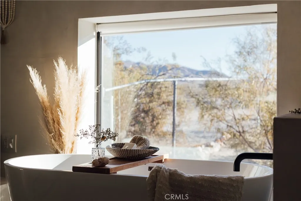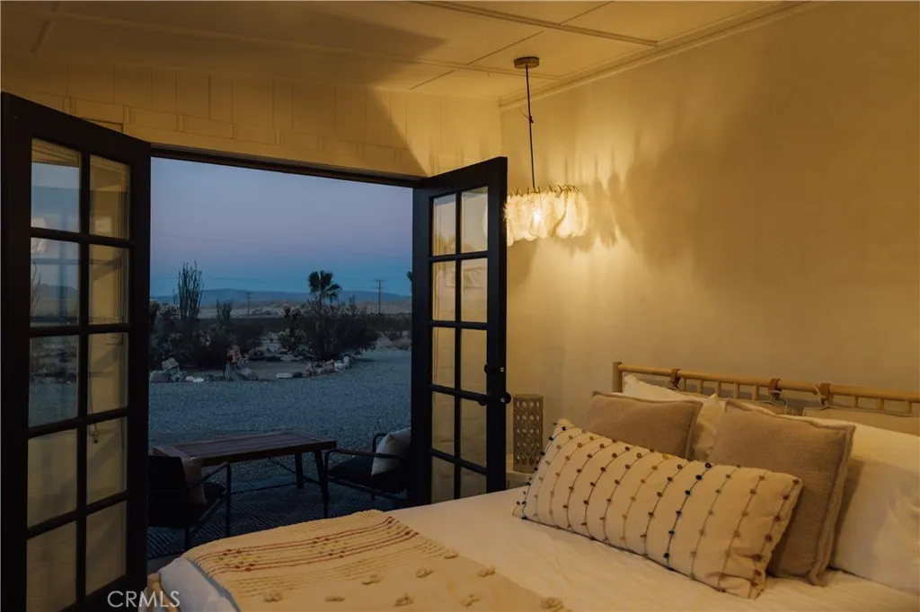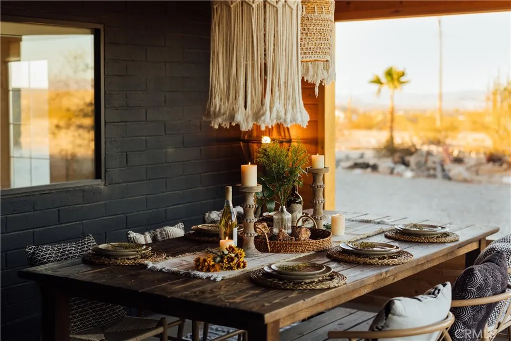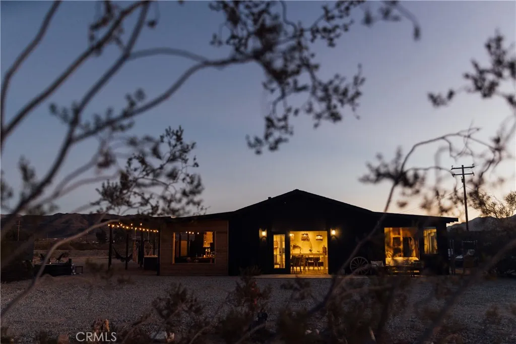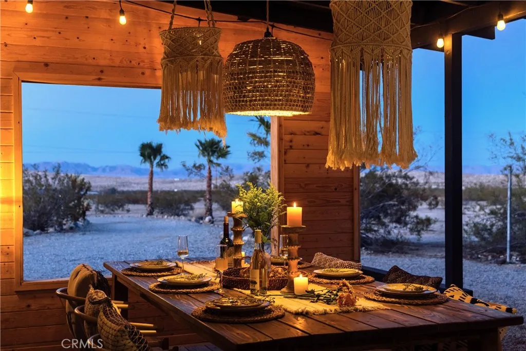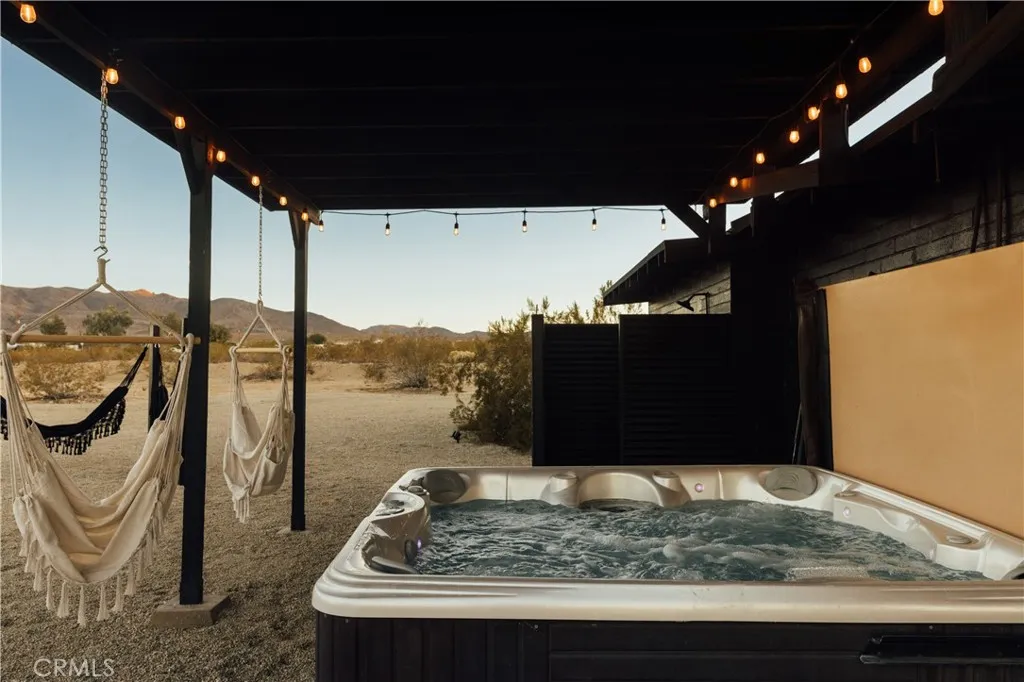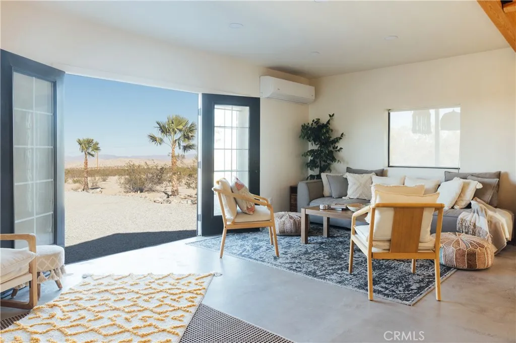 Welcome to Casa Del Desierto, a fully furnished 3-bedroom, 2-bathroom home on 2 private acres just 7 minutes from Joshua Tree National Park and minutes from local cafes, shops, and restaurants. This active short-term rental produced $76,000 in the last 12 months. Buyer to independently verify STR income and use. The home features an open floor plan with high ceilings, natural textures, and Tulum-inspired design throughout. Premium micro cement finishes in the kitchen and bathrooms, polished concrete floors, and energy-efficient mini split systems add style, comfort, and functionality. Thoughtfully designed interiors create a warm, relaxed atmosphere ideal for a primary residence, second home, or investment property. Outdoor amenities are designed for enjoying the desert lifestyle, with a private hot tub, cowboy tub, two fire pits, BBQ area, outdoor dining space, pyramid daybed, loungers, and an outdoor shower. Plenty of shaded areas, mature landscaping, 6 majestic palm trees, and a circular driveway enhance the propertys resort-like feel. The expansive lot offers mountain views, privacy, and space to relax under the desert sky. A rare opportunity to own a high-performing, turnkey desert retreat in a prime Joshua Tree location.