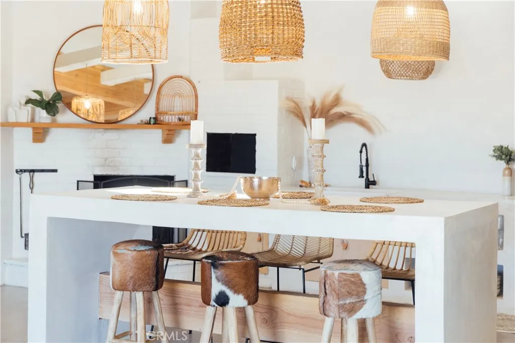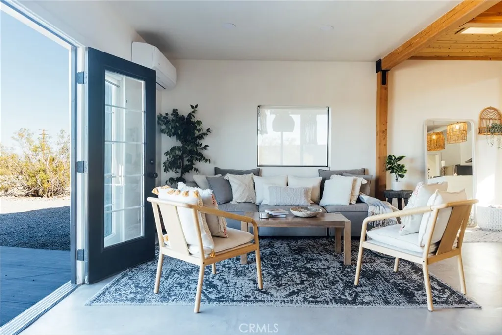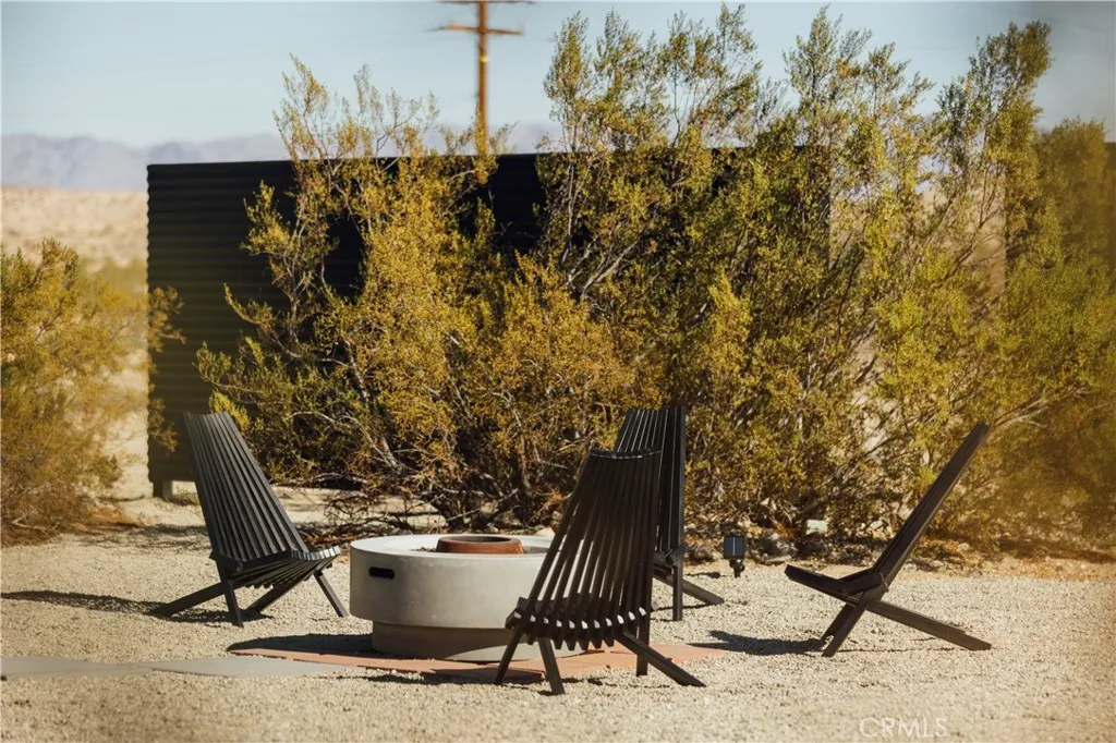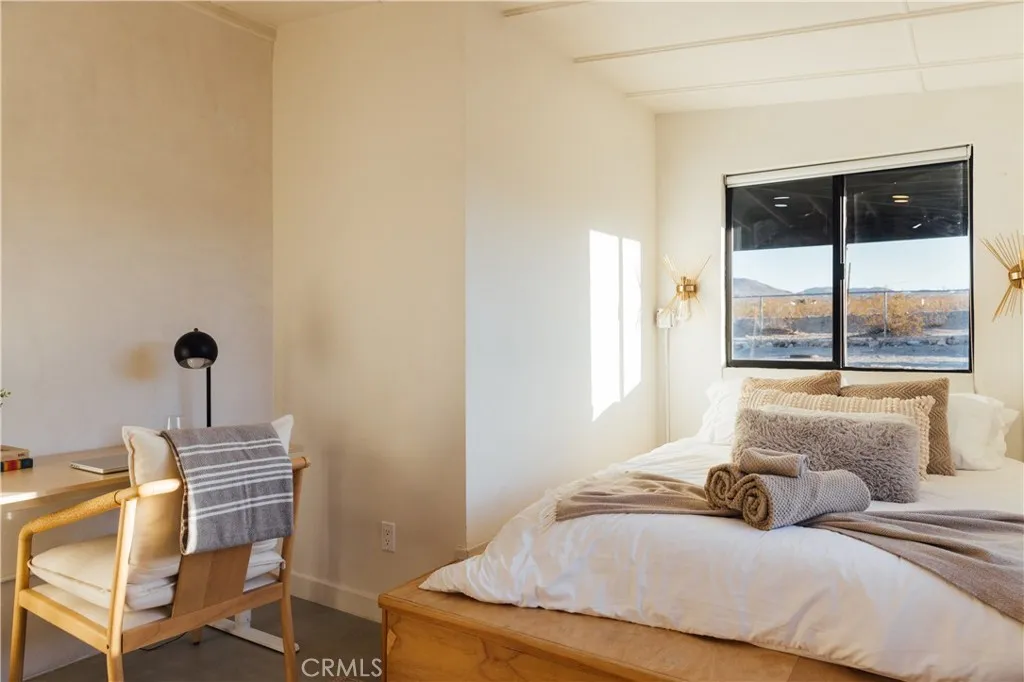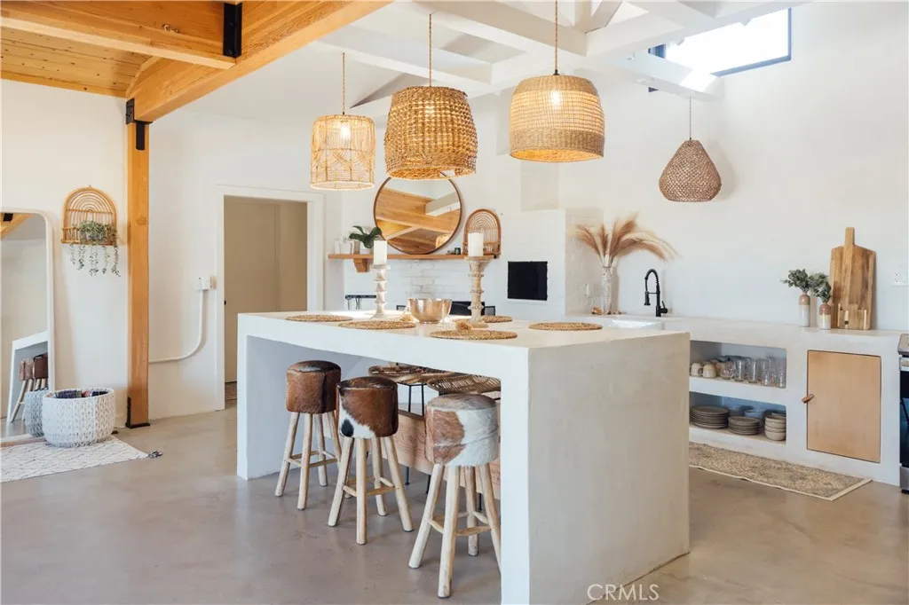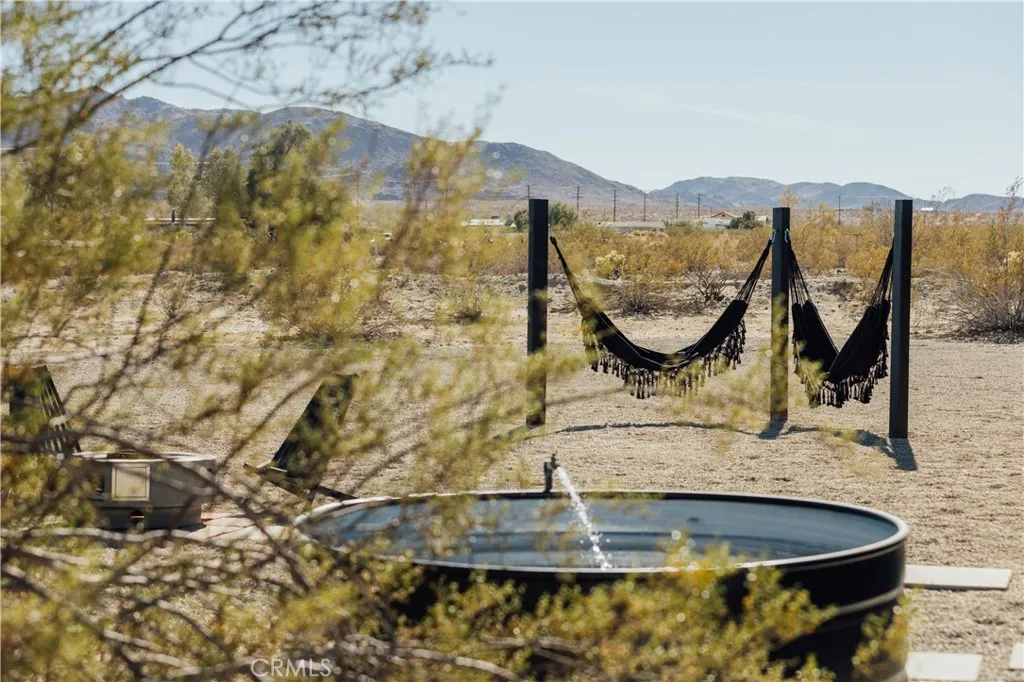 Welcome to Casa Del Desierto, a fully furnished 3-bedroom, 2-bathroom home on 2 private acres just 7 minutes from Joshua Tree National Park and minutes from local cafes, shops, and restaurants. This active short-term rental produced $76,000 in the last 12 months. Buyer to independently verify STR income and use. The home features an open floor plan with high ceilings, natural textures, and Tulum-inspired design throughout. Premium micro cement finishes in the kitchen and bathrooms, polished concrete floors, and energy-efficient mini split systems add style, comfort, and functionality. Thoughtfully designed interiors create a warm, relaxed atmosphere ideal for a primary residence, second home, or investment property. Outdoor amenities are designed for enjoying the desert lifestyle, with a private hot tub, cowboy tub, two fire pits, BBQ area, outdoor dining space, pyramid daybed, loungers, and an outdoor shower. Plenty of shaded areas, mature landscaping, 6 majestic palm trees, and a circular driveway enhance the propertys resort-like feel. The expansive lot offers mountain views, privacy, and space to relax under the desert sky. A rare opportunity to own a high-performing, turnkey desert retreat in a prime Joshua Tree location.