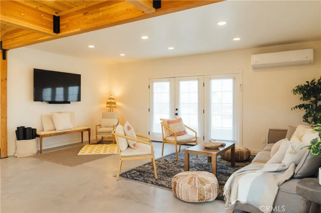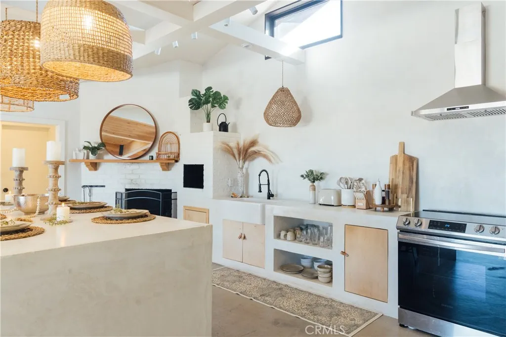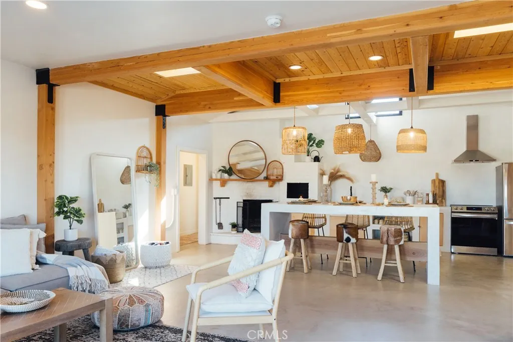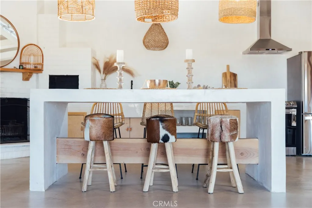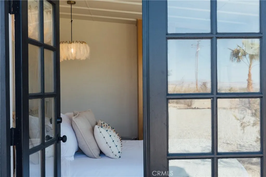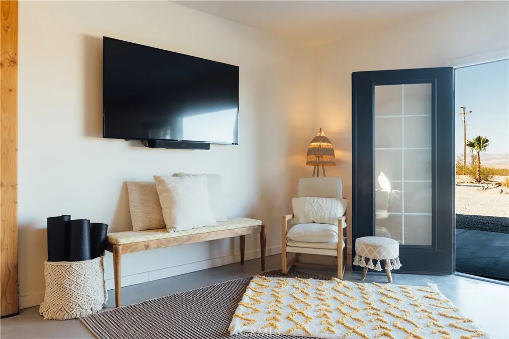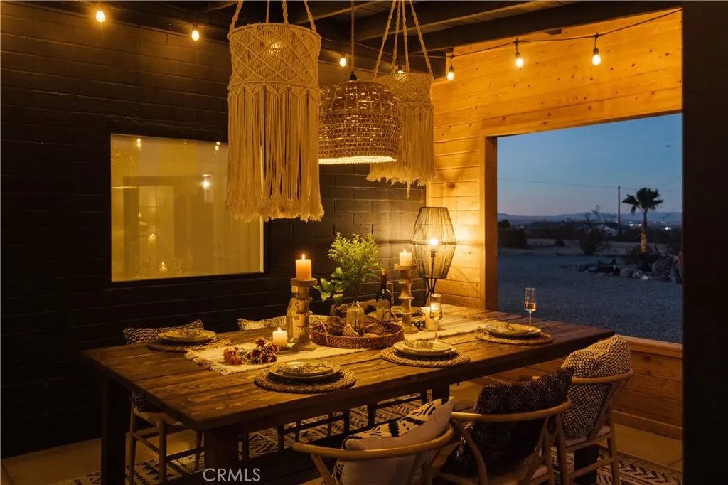 Welcome to Casa Del Desierto, a fully furnished 3-bedroom, 2-bathroom home on 2 private acres just 7 minutes from Joshua Tree National Park and minutes from local cafes, shops, and restaurants. This active short-term rental produced $76,000 in the last 12 months. Buyer to independently verify STR income and use. The home features an open floor plan with high ceilings, natural textures, and Tulum-inspired design throughout. Premium micro cement finishes in the kitchen and bathrooms, polished concrete floors, and energy-efficient mini split systems add style, comfort, and functionality. Thoughtfully designed interiors create a warm, relaxed atmosphere ideal for a primary residence, second home, or investment property. Outdoor amenities are designed for enjoying the desert lifestyle, with a private hot tub, cowboy tub, two fire pits, BBQ area, outdoor dining space, pyramid daybed, loungers, and an outdoor shower. Plenty of shaded areas, mature landscaping, 6 majestic palm trees, and a circular driveway enhance the propertys resort-like feel. The expansive lot offers mountain views, privacy, and space to relax under the desert sky. A rare opportunity to own a high-performing, turnkey desert retreat in a prime Joshua Tree location.