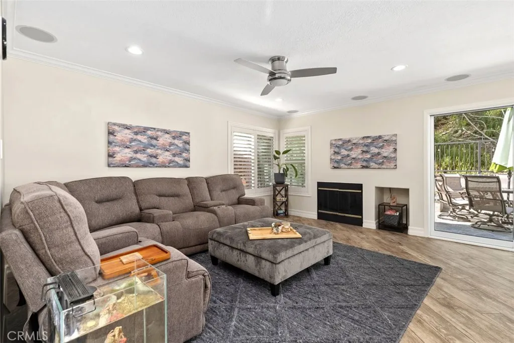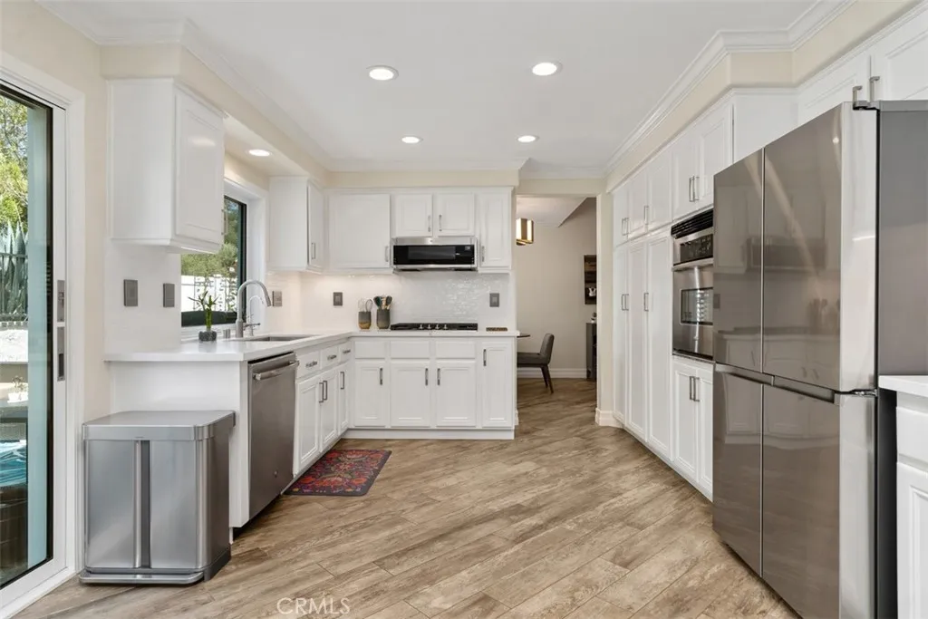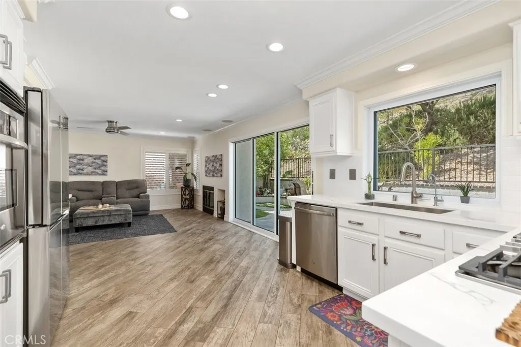 Welcome to this beautifully upgraded 4-bedroom home offering space, style, and comfort in all the right places! With all bedrooms conveniently located upstairs, 2.5 bathrooms, and approximately 2,000 square feet, this home is designed for modern living. Step through the double door entry and be greeted by soaring ceilings and an abundance of natural light. The main level features stylish wood flooring throughout and offers both an inviting living room and a spacious formal dining roomperfect for hosting gatherings. The formal dining room includes a slider to the backyard creating an indoor-outdoor flow. The updated kitchen is a true standout, showcasing quartz countertops, white painted cabinetry, a designer tile backsplash, and stainless steel appliances. The kitchen opens to the cozy family room, complete with a charming fireplace. A newly added Sky Wall or, tri-panel patio doors, create a seamless blend of indoor and outdoor living, ideal for entertaining and everyday living. Step outside to the low-maintenance backyard featuring a combination of hardscape and turf, along with multiple seating areasperfect for relaxing or hosting friends and family. Downstairs also includes a powder bathroom, laundry room, and direct access to the three-car garage. Heading upstairs, youll find a modern staircase leading to all four bedrooms. The primary suite offers a private ensuite bathroom featuring a separate tub and shower, dual pedestal sinks, and three closets. The three additional bedrooms are generously sized, and the secondary bathroom includes a single sink vanity and tub/show
