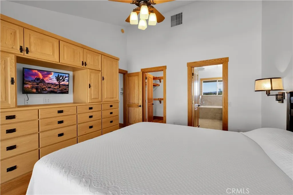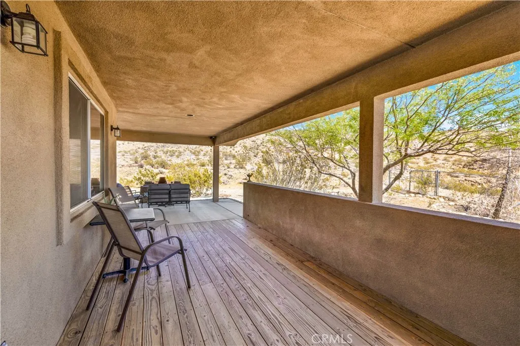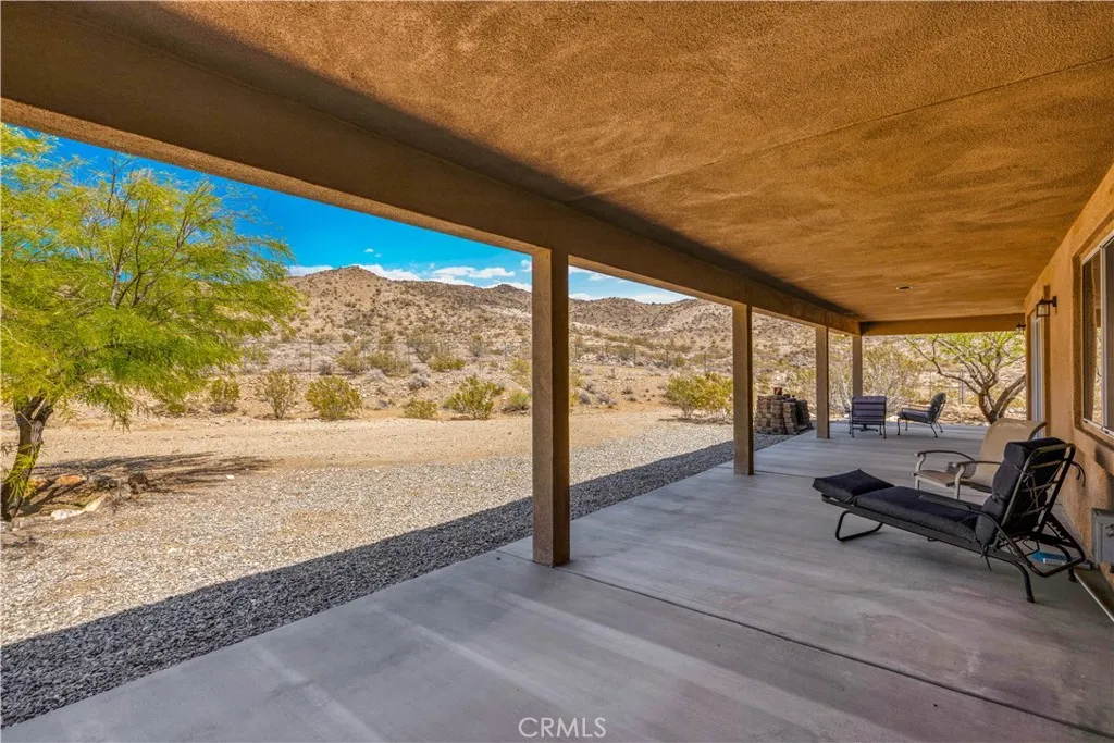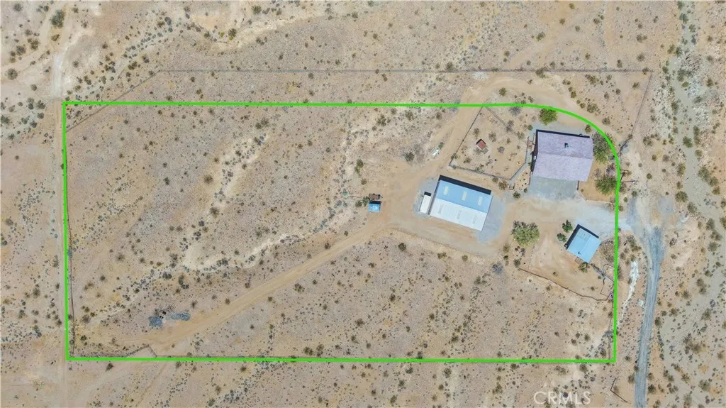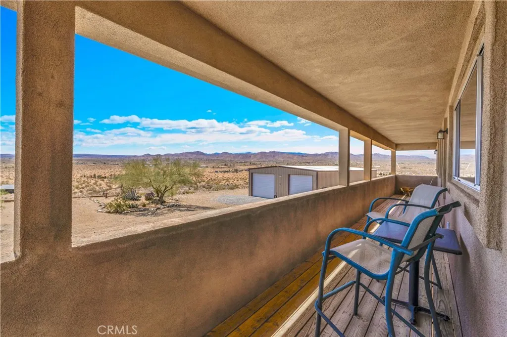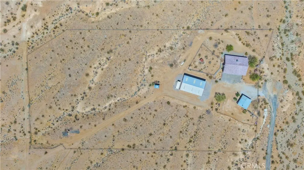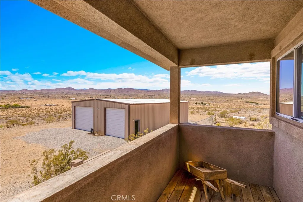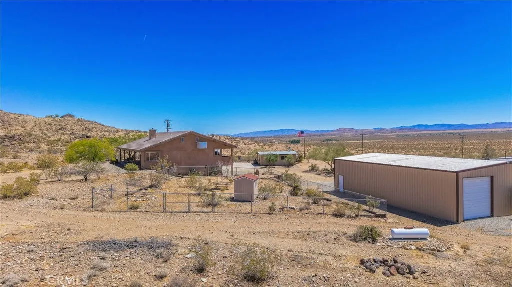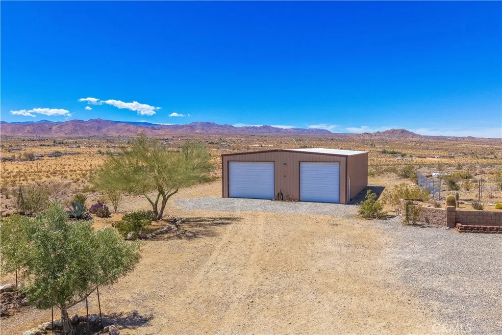Large two-story main home, additional cabin, and a 2,400 sq ft workshop all on a fenced 5-acre parcel. This unique property is the last home on the street, backed directly against the mountain, offering incredible panoramic views overlooking all of Landers and unmatched privacy. The 2012 custom-built two-story main home features high-end finishes throughout, including real wood flooring, custom oak cabinetry, and laundry rooms on both levels. The upper level showcases vaulted ceilings and an open-concept layout, with a spacious kitchen featuring raw-edge granite countertops, abundant cabinetry, and ample workspace. The living room includes a wood stove and multiple sliders leading to both the front wraparound balcony and back patio. Bedrooms are generously sized, and the primary suite offers a massive walk-in closet, patio access, and a beautifully finished bathroom with soaking tub and walk-in shower. A bedroom on the lower level and a fully finished two-car garage add to the flexibility. The separate cabin provides excellent additional living space for guests, featuring an open layout, well-preserved retro charm, beautiful views, its own bathroom with walk-in shower, front porch, and a cross-fenced yard. The 2,400 sq ft metal workshop is a standout feature, equipped with three RV-height roll-up doors, power throughout with multiple 220 outlets, laundry hookups, a car lift, and custom fabrication tables with built-in storageideal for hobbyists, contractors, or business use. Additional features include a Connex storage container and full RV hookups. Properties offering this
