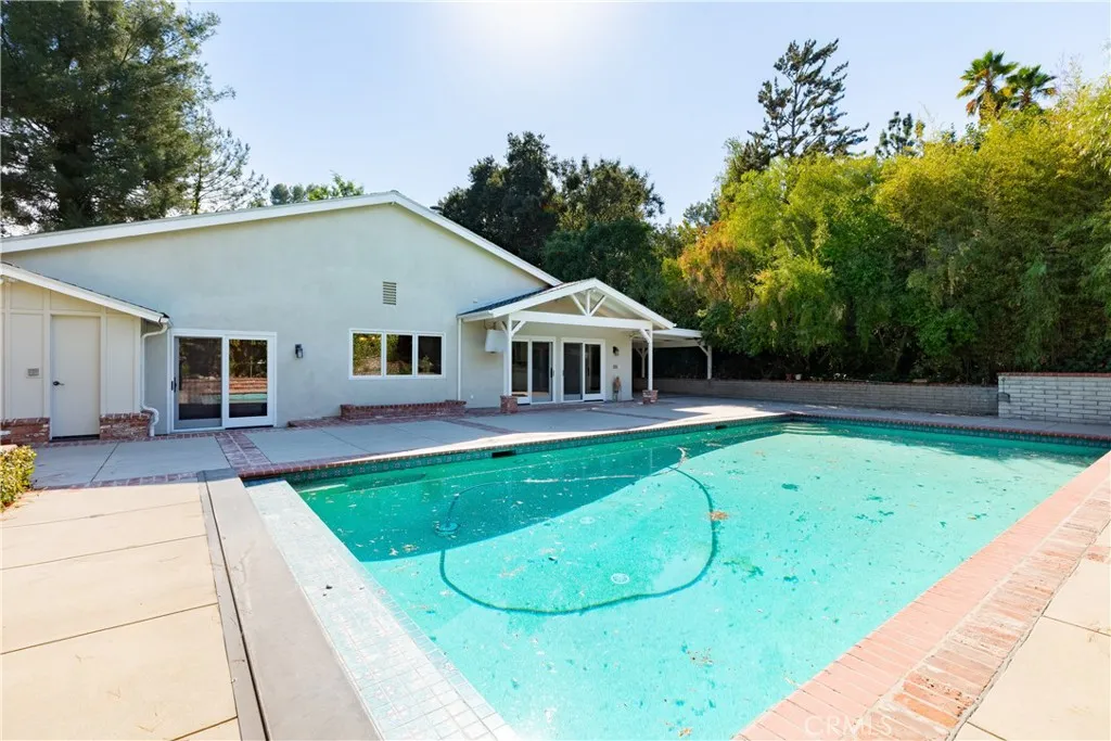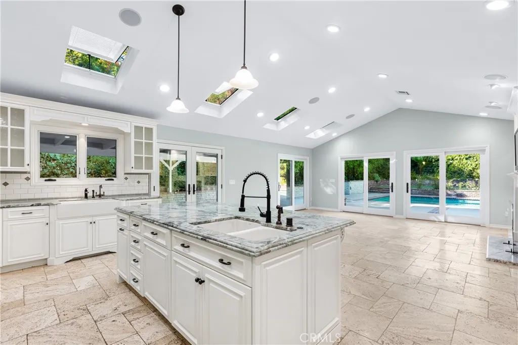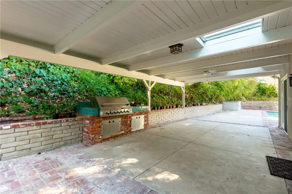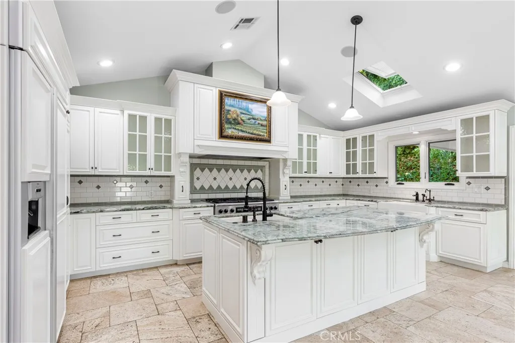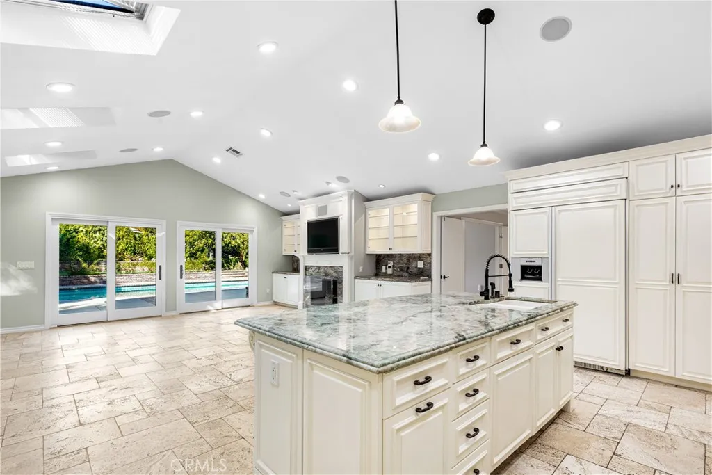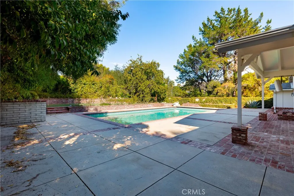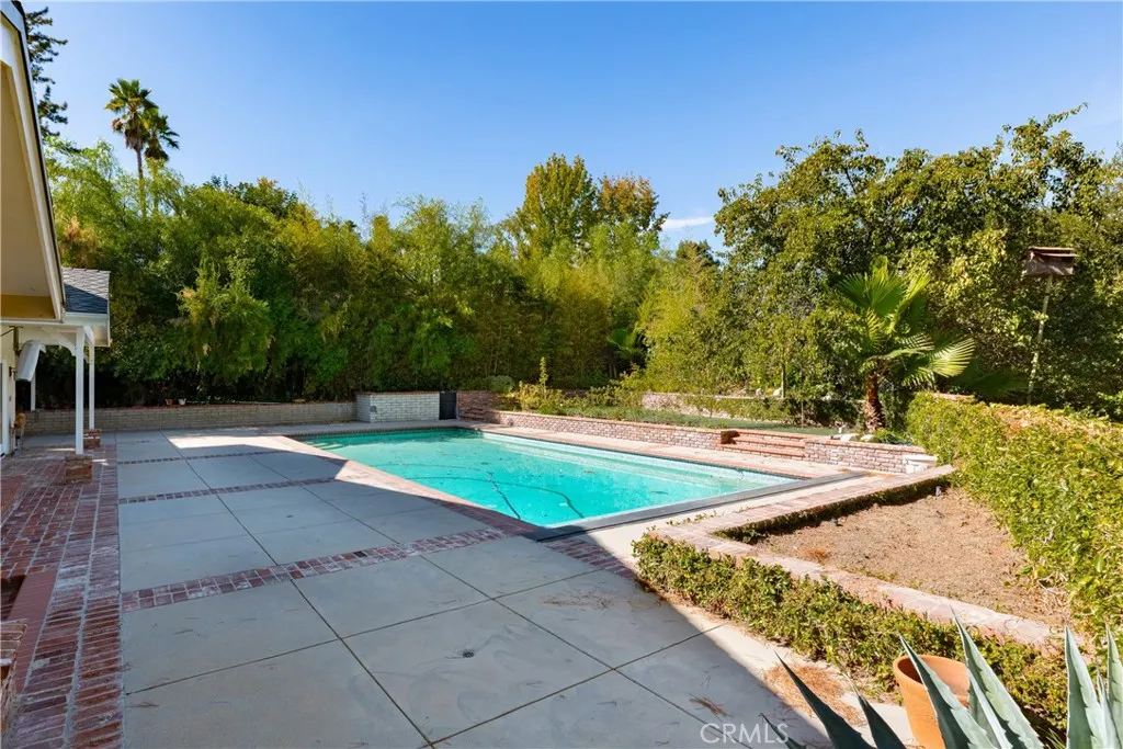 Set above the street on an exclusive cul-de-sac in Encino south, is this remodeled 4BR Traditional gem. Spanning a lot incorporating over 17,000 sq ft per assessor, this amazing property is tailor made for entertaining. A large and bright foyer/gallery, ideal for art, greets you as you enter, and leads to a spacious step-down living room/media room, including wood floors, a built-in entertainment unit, and a picturesque French window. The oversized formal dining room features custom wood crown moldings and a built-in china cabinet with elegant wood and beveled-glass accents. The focal point of the home is the dramatic state-of-the-art skylit kitchen/family room, highlighted by a striking granite center island, an Italian tile backsplash, hand-done cabinetry, 2 sinks, and a Dacor commercial 6-burner range. The family room, overlooking the pool, has a vaulted ceiling, travertine floors, a marble fireplace, and maple wood-built ins. The luxurious primary suite provides dual vanities, a granite and mosaic shower, a spa tub and walk-in closet. All the secondary bedrooms are abundant in size and have mirrored wardrobes. The private and expansive back yard is comprised of a sparkling brick-laced Pebble Tec pool, green, multiple patios, and hill views. An added bonus is the 3-car garage with an array of built-ins. Minutes to Ventura Blvd and its many vibrant dining and shopping options.