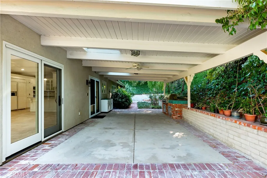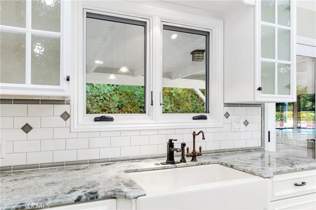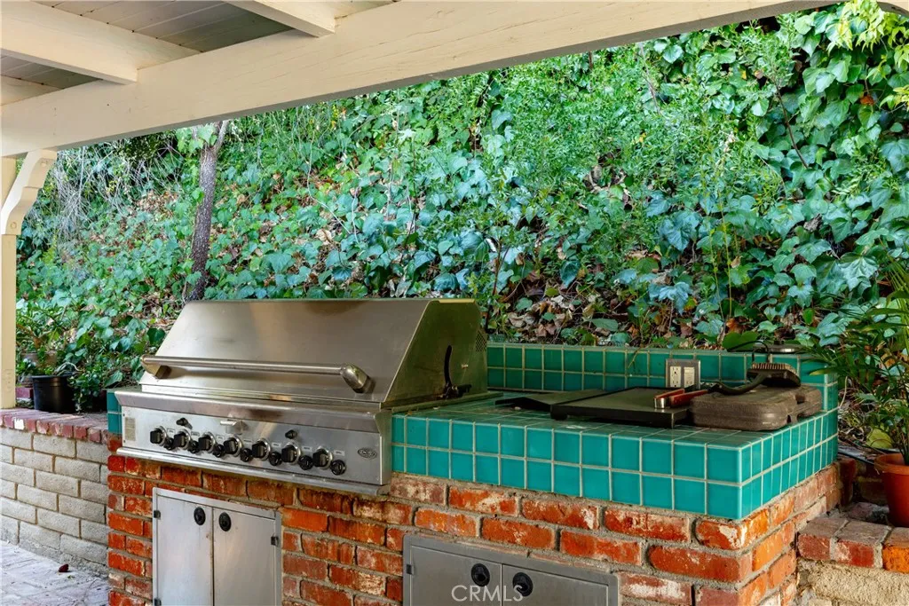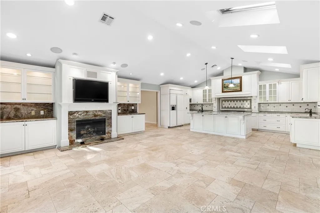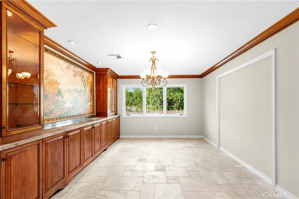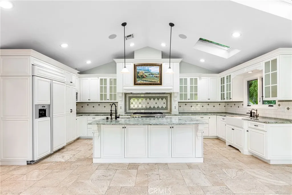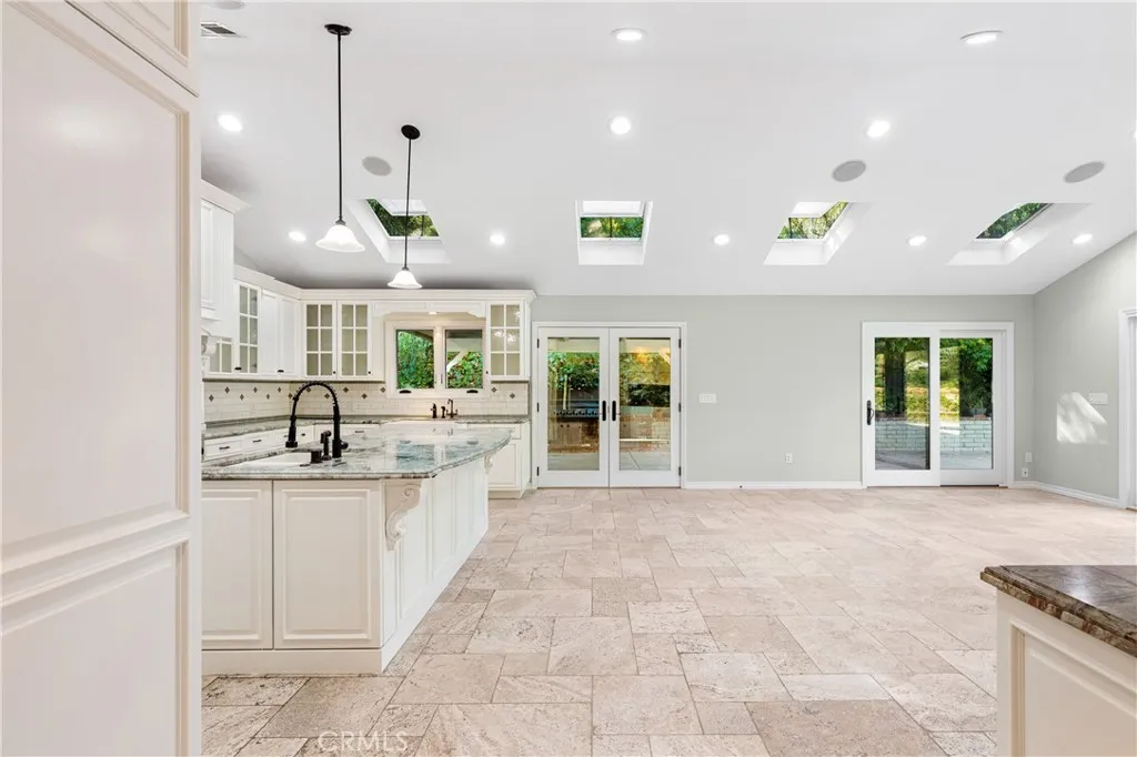 Set above the street on an exclusive cul-de-sac in Encino south, is this remodeled 4BR Traditional gem. Spanning a lot incorporating over 17,000 sq ft per assessor, this amazing property is tailor made for entertaining. A large and bright foyer/gallery, ideal for art, greets you as you enter, and leads to a spacious step-down living room/media room, including wood floors, a built-in entertainment unit, and a picturesque French window. The oversized formal dining room features custom wood crown moldings and a built-in china cabinet with elegant wood and beveled-glass accents. The focal point of the home is the dramatic state-of-the-art skylit kitchen/family room, highlighted by a striking granite center island, an Italian tile backsplash, hand-done cabinetry, 2 sinks, and a Dacor commercial 6-burner range. The family room, overlooking the pool, has a vaulted ceiling, travertine floors, a marble fireplace, and maple wood-built ins. The luxurious primary suite provides dual vanities, a granite and mosaic shower, a spa tub and walk-in closet. All the secondary bedrooms are abundant in size and have mirrored wardrobes. The private and expansive back yard is comprised of a sparkling brick-laced Pebble Tec pool, green, multiple patios, and hill views. An added bonus is the 3-car garage with an array of built-ins. Minutes to Ventura Blvd and its many vibrant dining and shopping options.