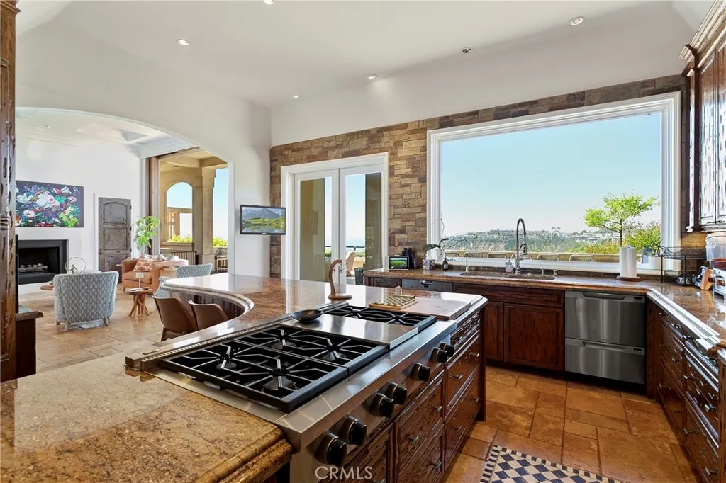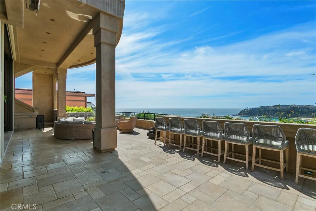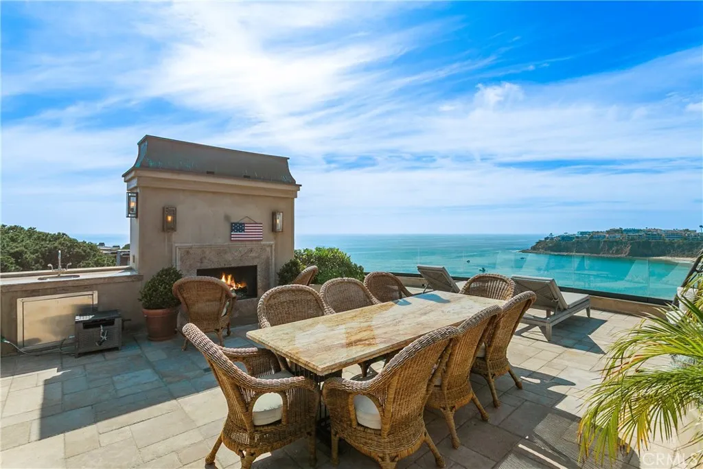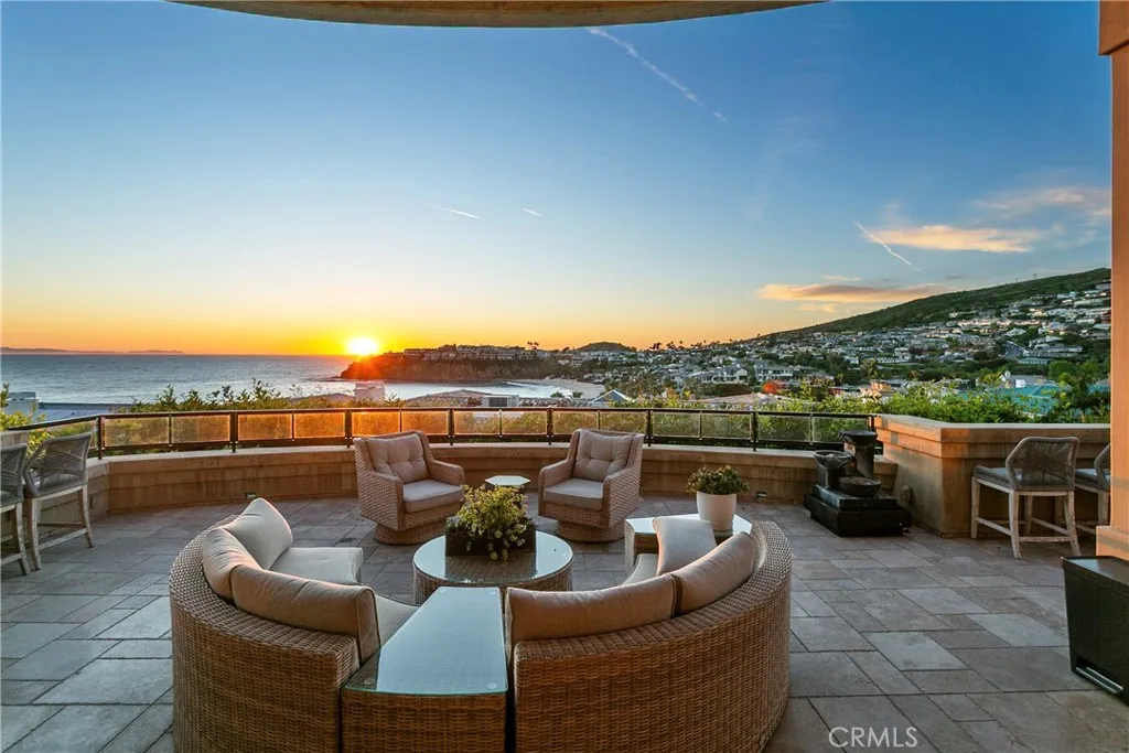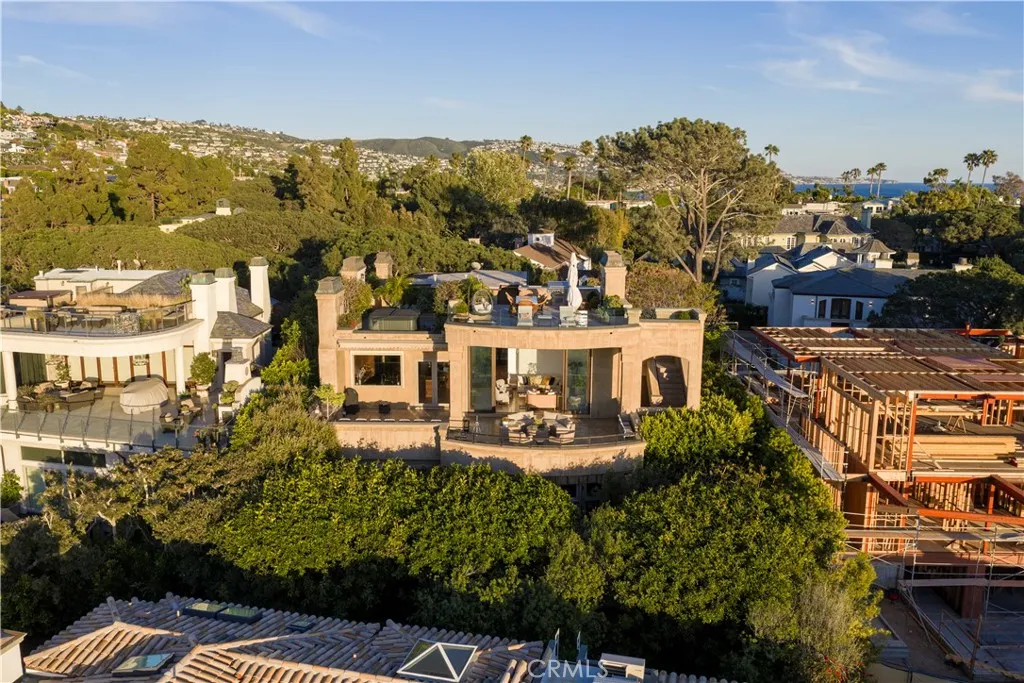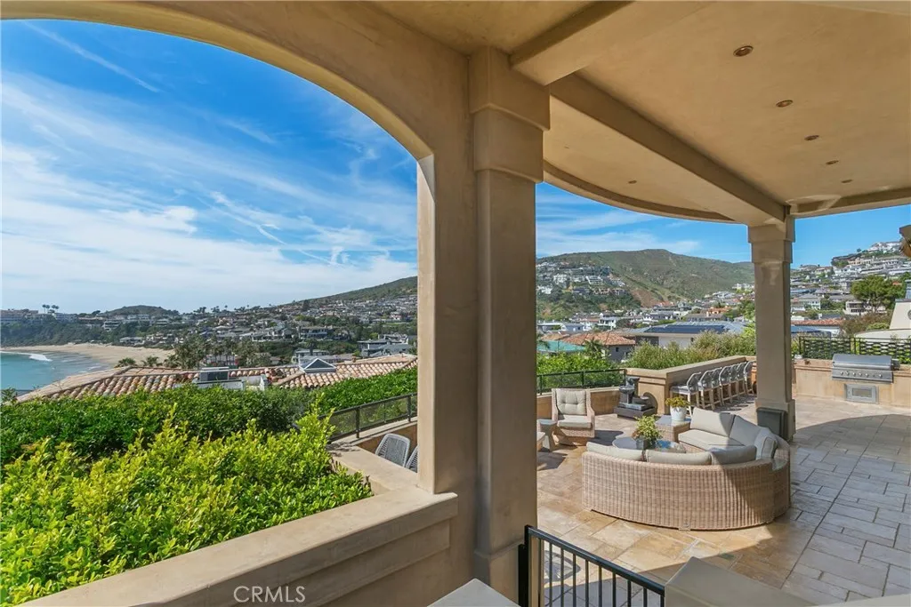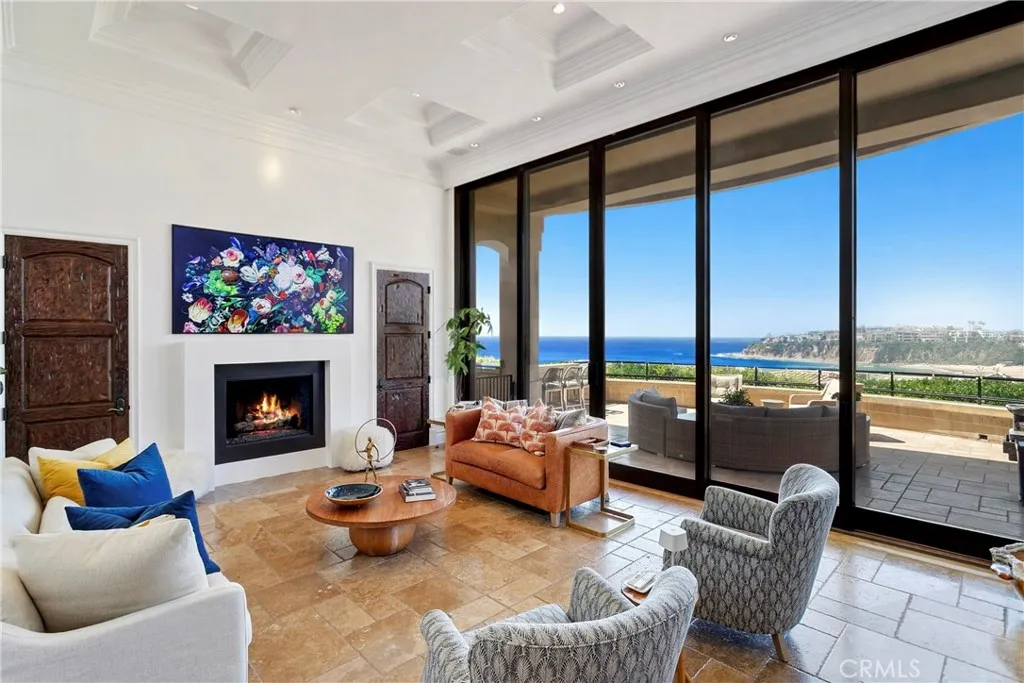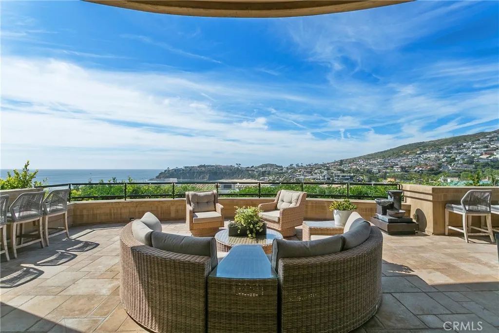 A residence of this caliber is rarely available. Set above one of Laguna Beachs most dramatic stretches of coastline, this custom estate offers sweeping views of the Pacific, Catalina Island, and the rugged shoreline. Surrounded by the historic Smithcliffs pine trees, the property provides privacy and a unique sense of place. The architecture blends classic and modern influences, with interiors designed to connect seamlessly to terraces, gardens, and sun-filled outdoor spaces. The main level supports both entertaining and everyday living, beginning with a striking foyer and floating spiral staircase. The great room opens through large sliding doors to the main ocean-facing terrace. The kitchen features custom wood cabinetry, an oversized island, walk-in pantry, and professional-grade appliances from Wolf, Fisher & Paykel, Sub-Zero, and Miele. A formal dining room with a cross-vaulted ceiling opens to the outdoors through newer Fleetwood French doors. Approximately 7,119 square feet, the home includes four ensuite bedrooms and nine baths. The privately positioned primary suite opens to a meditation garden and includes two walk-in closets and a jetted tub. Additional features include handcrafted finishes, custom mosaics, wood and stone flooring, three fireplaces, multiple wet bars, a temperature-controlled wine cellar, upgraded AV system, newer generator, and an elevator. The lower level showcases an exceptional 11-car garagean uncommon amenity in coastal Laguna Beachideal for collectors or those seeking a display gallery or workshop. The rooftop deck offers a private retreat