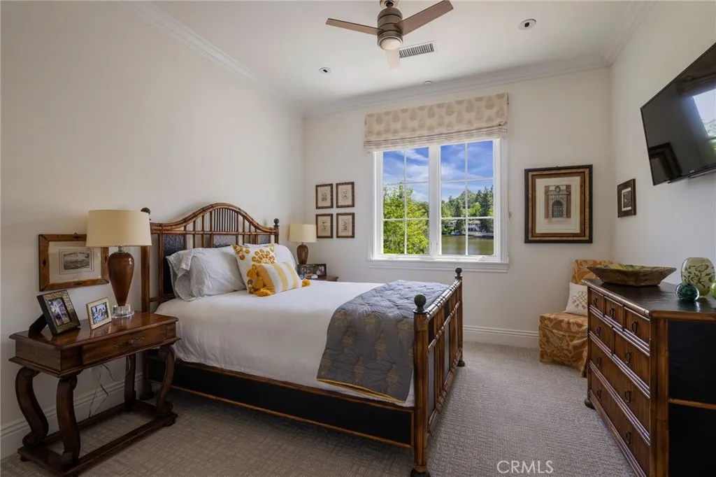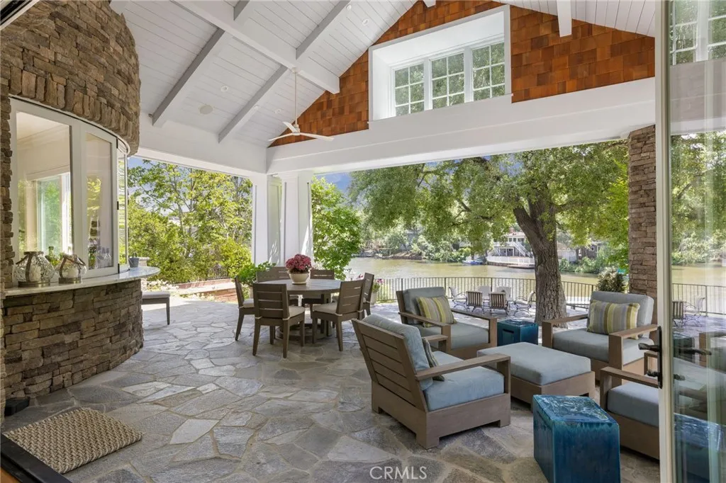 Experience lakeside living at its finest on Private Malibou Lake, within the exclusive Malibou Lake Mountain Club. Tucked behind gates on a private street shared by just five homes, this rare property is one of only 35 residences set directly on the lake. Custom-built and owner-occupied since 2013, the home offers a thoughtfully designed floor plan featuring a spacious downstairs primary suite with a luxurious bathroom and ample closet space. Two additional en-suite bedrooms, along with a den/office and a gym, provide flexibility for both living and working. Step through the front door into a stunning great room with soaring beamed ceilings, rich wood floors, and a floor-to-ceiling wood-burning fireplace. The space flows seamlessly into a gourmet kitchen, dining area, and wraparound bar perfect for entertaining. Expansive doors open to a large 467 sq. ft. covered loggia, complete with vaulted ceilings and a second wood-burning fireplace, creating an inviting indoor-outdoor living experience ideal for year-round dining or relaxing by the lake. Outside, enjoy a built-in BBQ, bocce ball court, and multiple sun-drenched seating areas overlooking the water. Just steps away, your private dock offers direct access to the lake perfect for boating, fishing, or simply unwinding in a serene setting. Whether you're seeking a full-time residence or a weekend escape just 50 minutes from Century City or Beverly Hills, this exceptional property offers the best of both worlds and may very well be the finest home on the lake. Please allow a minimum of 24 hours' notice for showings.