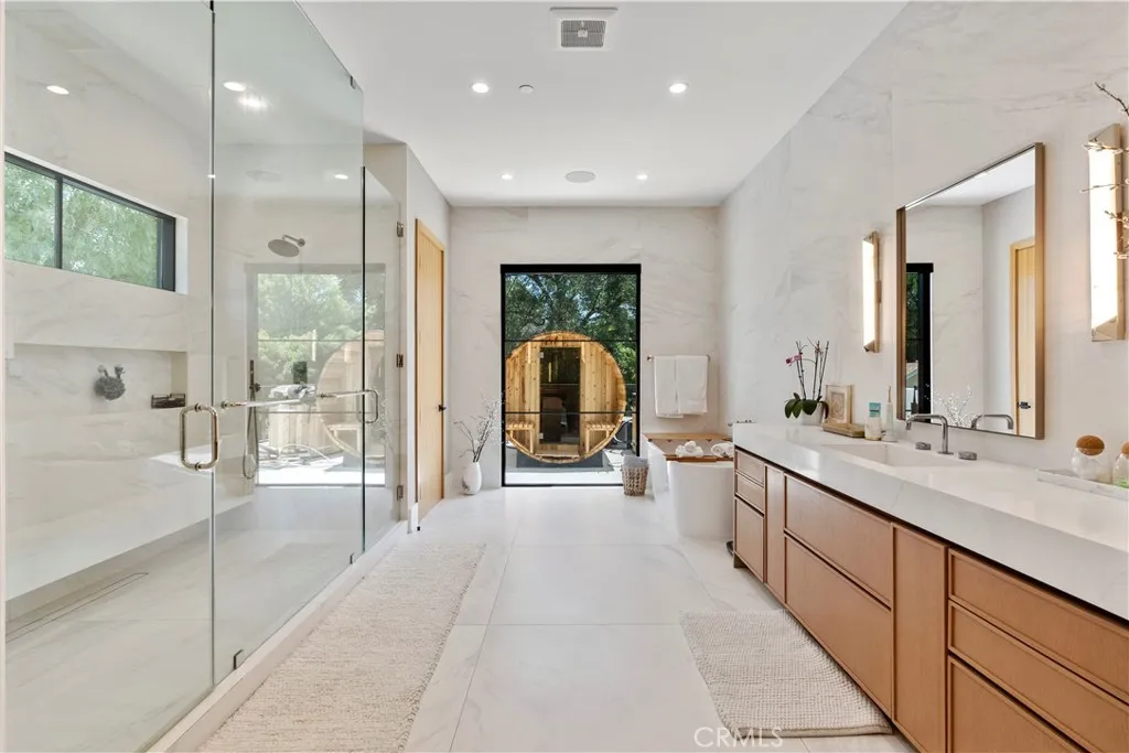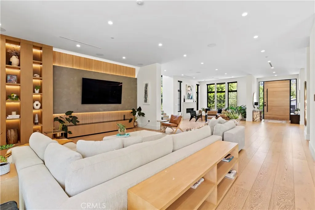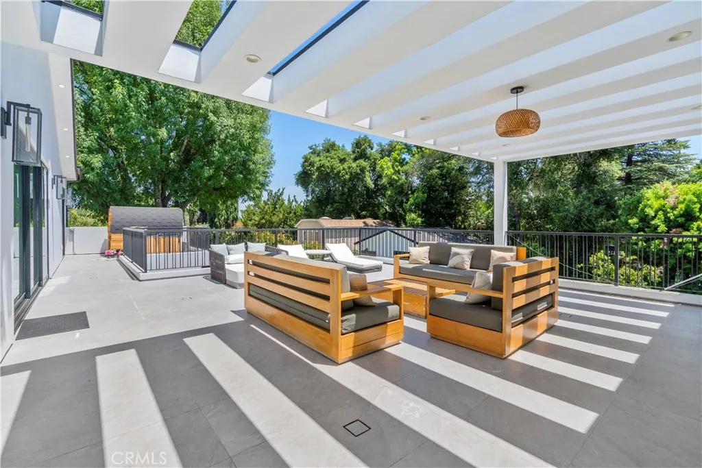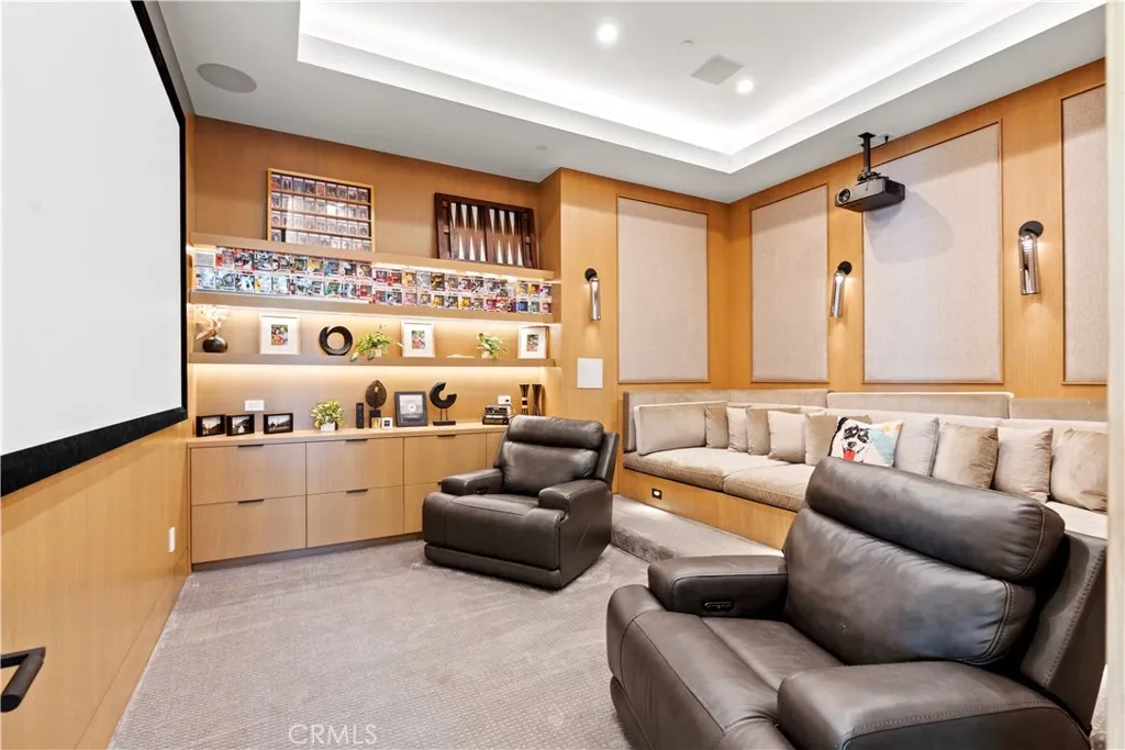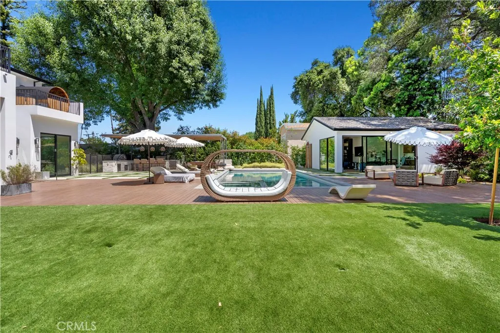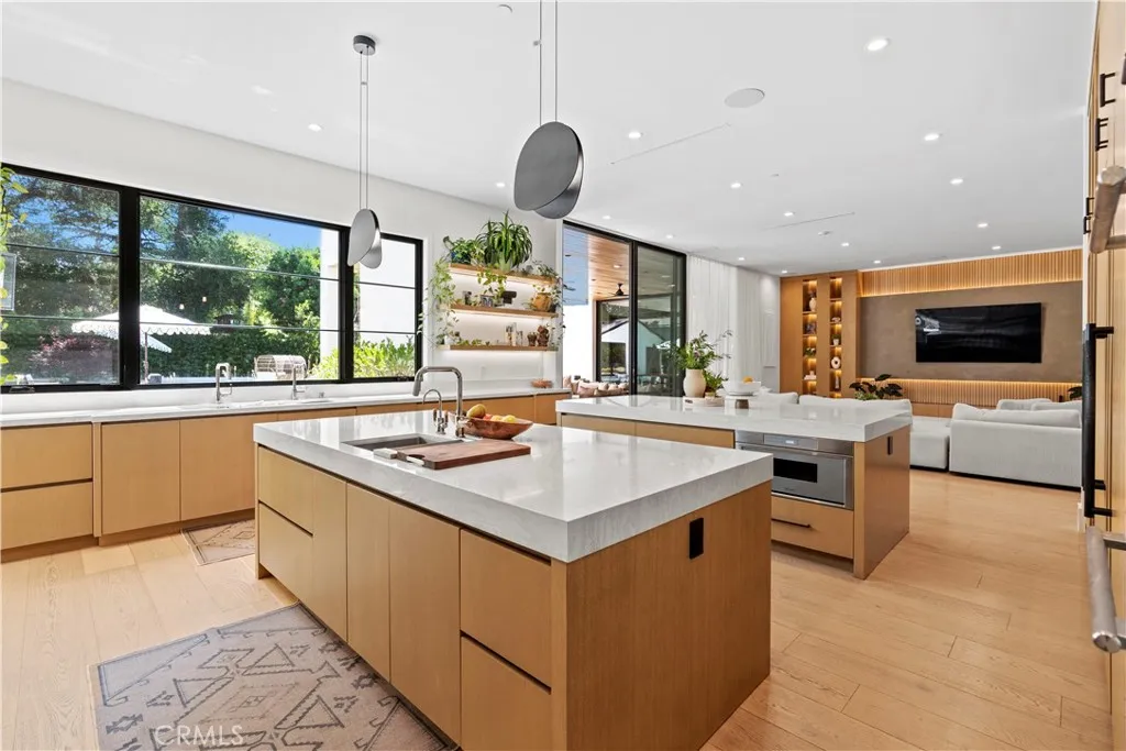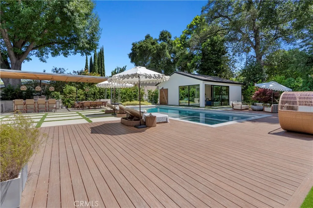 AVAILABLE 06/15/26 - Set on a coveted corner lot south of the Boulevard in Woodland Hills, this extraordinary newer-construction estate is a masterclass in modern luxury, seamlessly blending refined design, advanced technology, and resort-inspired living. From the moment you enter, the home reveals a level of craftsmanship and intention rarely seenwhere every finish, feature, and system has been thoughtfully curated. The heart of the home is a stunning chefs kitchen outfitted with Thermador built-in appliances, complemented by a fully equipped secondary dirty kitchen designed for effortless entertaining. With dual dishwashers, two refrigerators, three full sinks, and a reverse osmosis beverage station with instant hot water, the space is as functional as it is beautiful. Technology is fully integrated yet elegantly discreet, with a Control4 smart home system, automatic blinds throughout, and enterprise-grade Wi-Fi powered by a dedicated server and multiple extenders. Over 30 in-wall speakers create a seamless multi-zone audio experience, while a custom 105-inch home theater with 8K projection, Dolby Atmos surround sound, acoustic paneling, and bespoke recliner seating delivers a true cinematic escape. The home continues to impress with custom cabinetry in every room, multiple hidden safes, a private gym, and a host of thoughtful luxury detailsincluding Toto resort-style washlets for elevated everyday living. Designed to rival a five-star resort, the outdoor spaces are nothing short of spectacular. A sprawling 46-foot resort-style pool and spa with Baja shelf, Wi-Fi controls