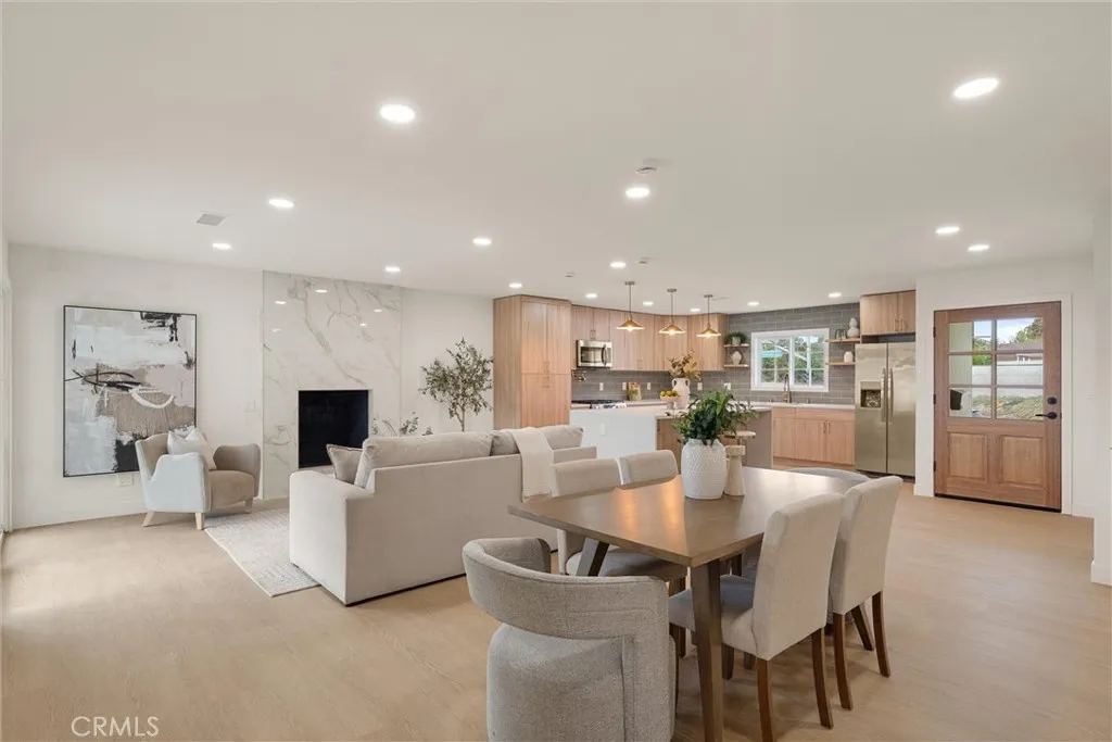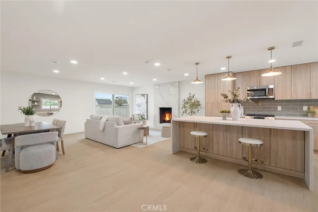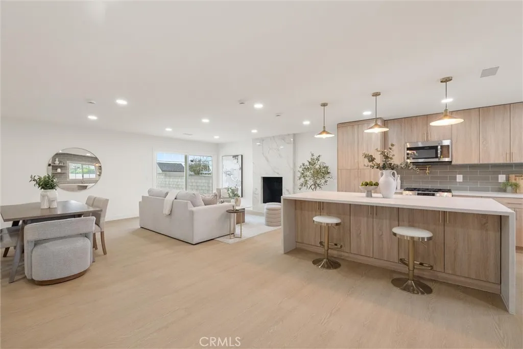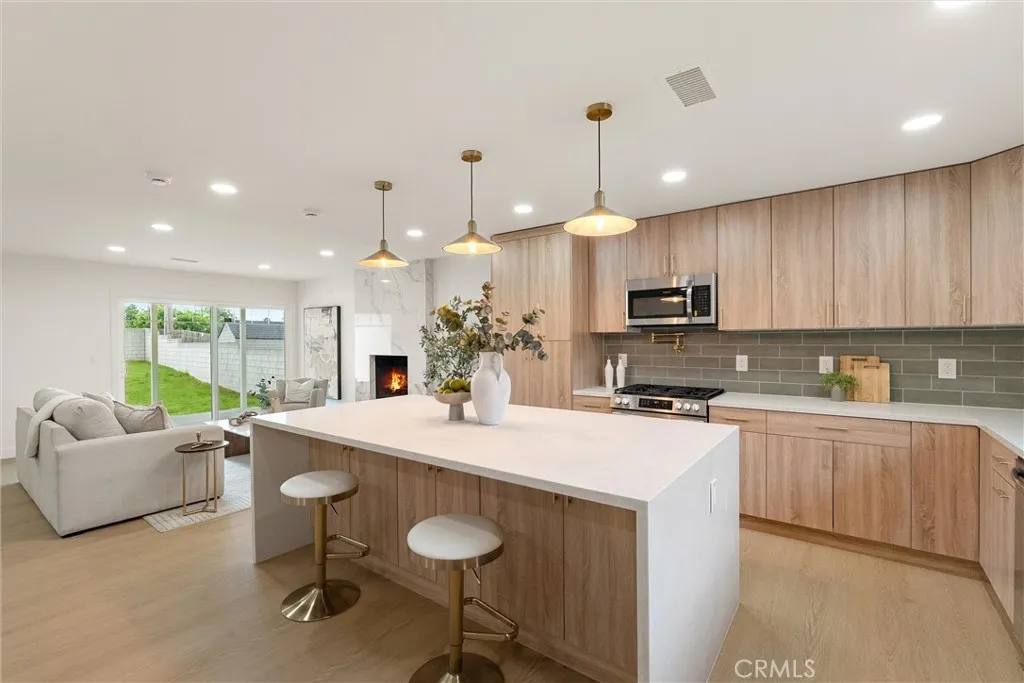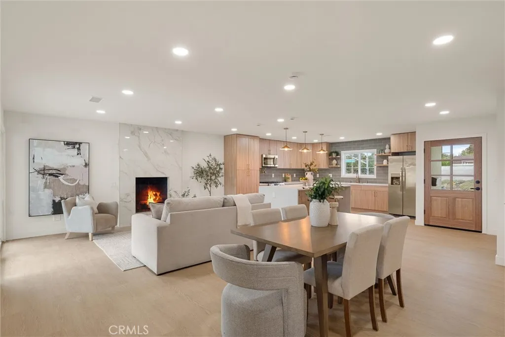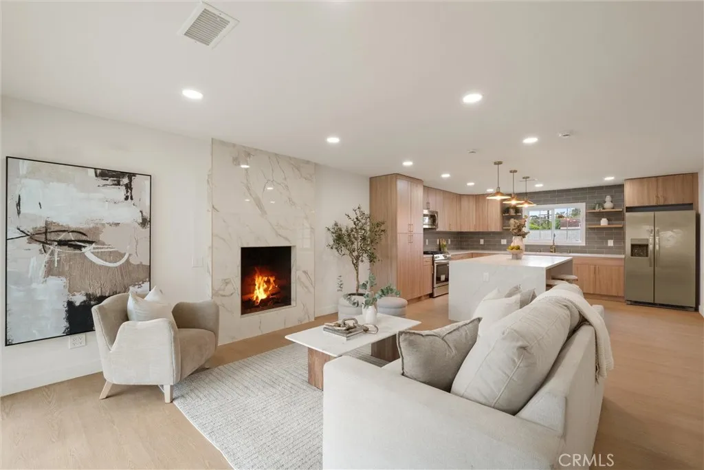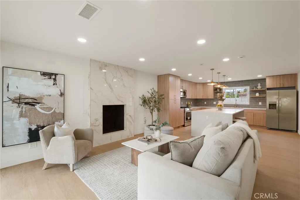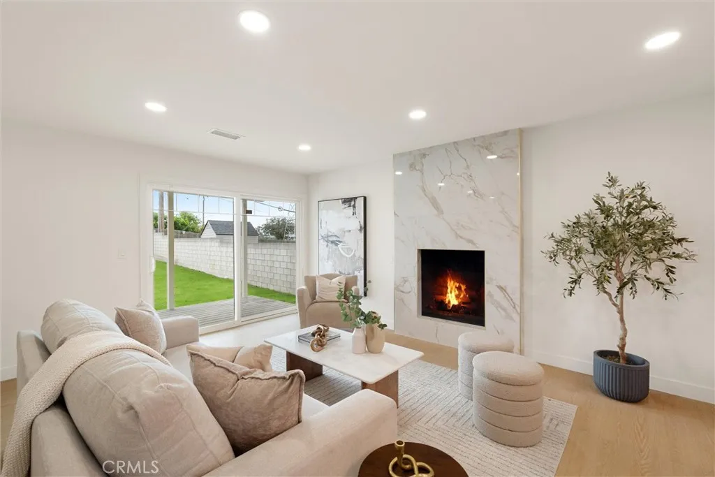 Welcome to this beautifully reimagined home in the heart of Carson, where modern design meets everyday comfort. This turnkey property features an open-concept layout with wide-plank SPC flooring, recessed lighting, and a seamless flow between the living, dining, and kitchen areas, perfect for both entertaining and daily living. The stunning chefs kitchen is the centerpiece of the home, showcasing custom wood cabinetry, sleek quartz countertops, a large waterfall island with seating, pendant lighting, stainless steel appliances, and a stylish tile backsplash. Unwind in the inviting living room, complete with a contemporary fireplace and abundant natural light from the sliding glass doors leading to the backyard. The spa-inspired bathroom offers a freestanding soaking tub, double shower, modern fixtures, and clean, elegant finishes. Step outside to a spacious backyard filled with incredible potential. Whether you envision building an ADU, adding a pool, creating a garden retreat, or designing the ultimate outdoor entertainment space, the possibilities are truly endless. Additional upgrades include newer windows, updated electrical and plumbing fixtures, and a thoughtfully designed interior with warm, modern touches throughout. The home also features a spacious front yard, attached 2-car garage, and great curb appeal.