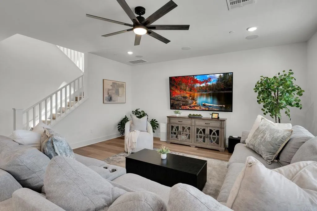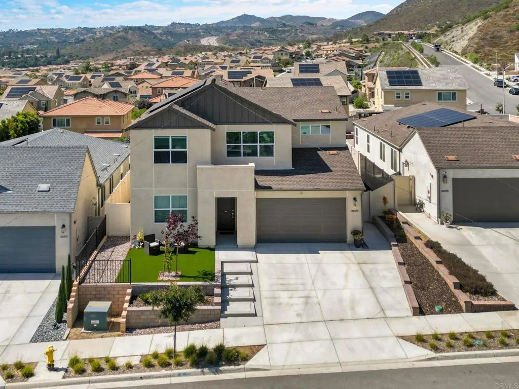 Welcome to Citro, Fallbrook's most vibrant master-planned community, where modern design, scenic surroundings, & everyday comfort come together in this beautifully appointed home on Orchard Trail. Thoughtfully designed with a clean, open-concept layout, this home offers the perfect blend of functionality and style for both daily living and entertaining. From the moment you step inside, you'll appreciate the high ceilings & light-filled living spaces, contemporary finishes, and seamless flow between the kitchen, dining, and living areas-creating an inviting atmosphere that feels both spacious and connected. The kitchen serves as the heart of the home, featuring ample cabinetry, sleek countertops, and a layout ideal for hosting or enjoying quiet nights in. Upstairs, the generously sized primary suite offers a true retreat-highlighted by a north west facing balcony that captures panoramic hillside views and breathtaking sunset skies, delivering a daily dose of serenity that's hard to find. Whether you're starting your morning with coffee or unwinding at the end of the day, this elevated outdoor space is a standout feature that sets the home apart. Additional living spaces provide flexibility for a home office, guest accommodations, or growing household needs, while the overall layout is designed to maximize comfort and livability. Situated within the thoughtfully planned Citro community, residents enjoy access to scenic walking trails, parks, and gathering spaces that foster a strong neighborhood feelall while being conveniently located with easy access to nearby amenities, di